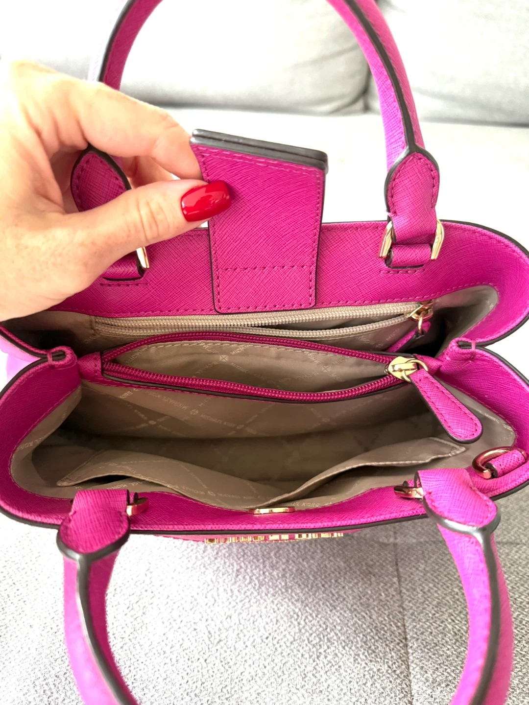 1 Middle zippered divider compartment, 1 zippered pocket and 1 slip pocket, MK signature fabric lining.