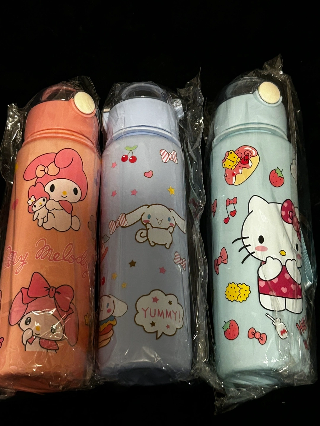 These Sanrio character water bottles are brand new and super cute! Available in My Melody (pink), Cinnamoroll (blue), and Hello Kitty (light blue). Perfect for staying hydrated in style! $10 each or $30 for all