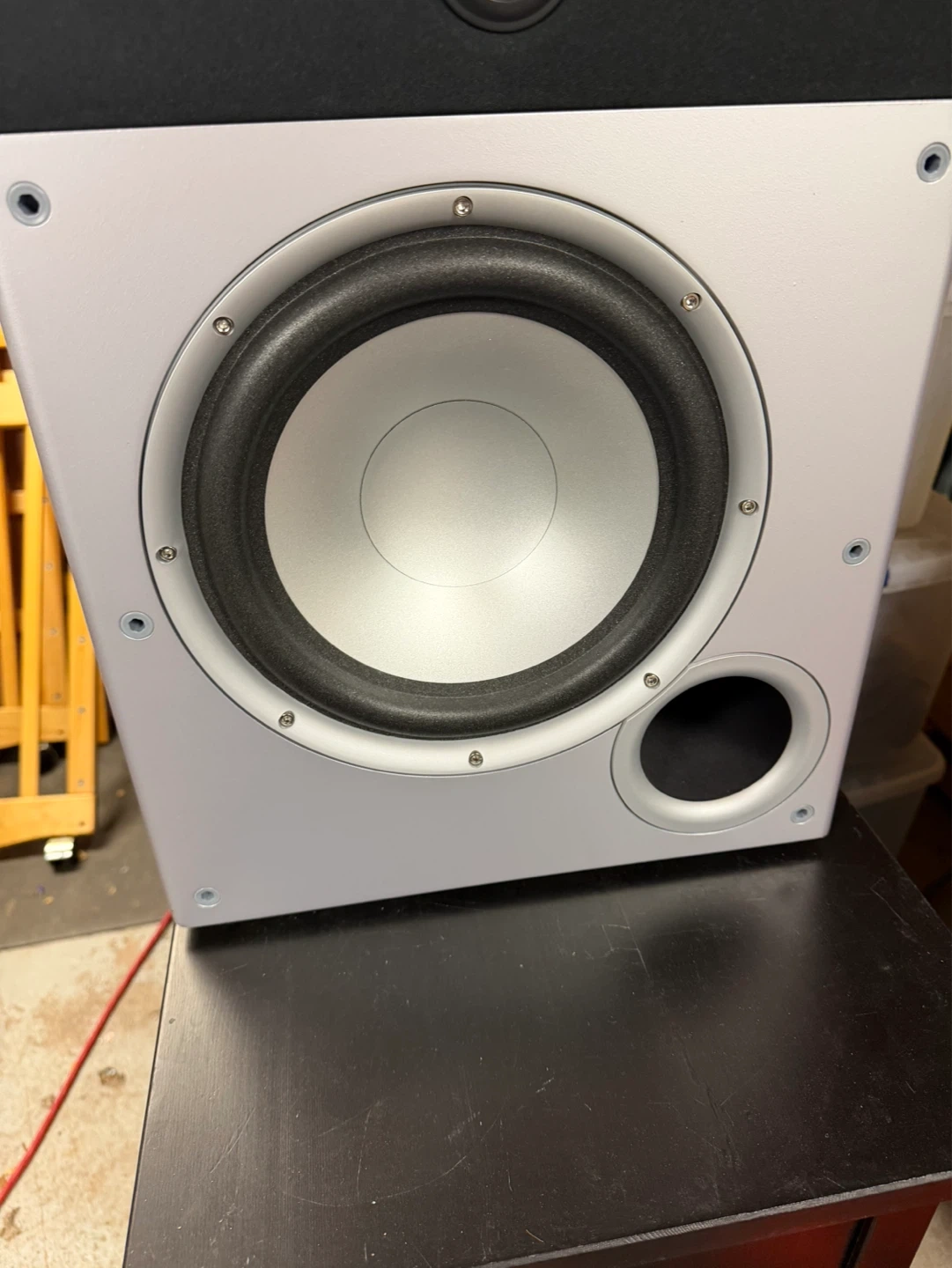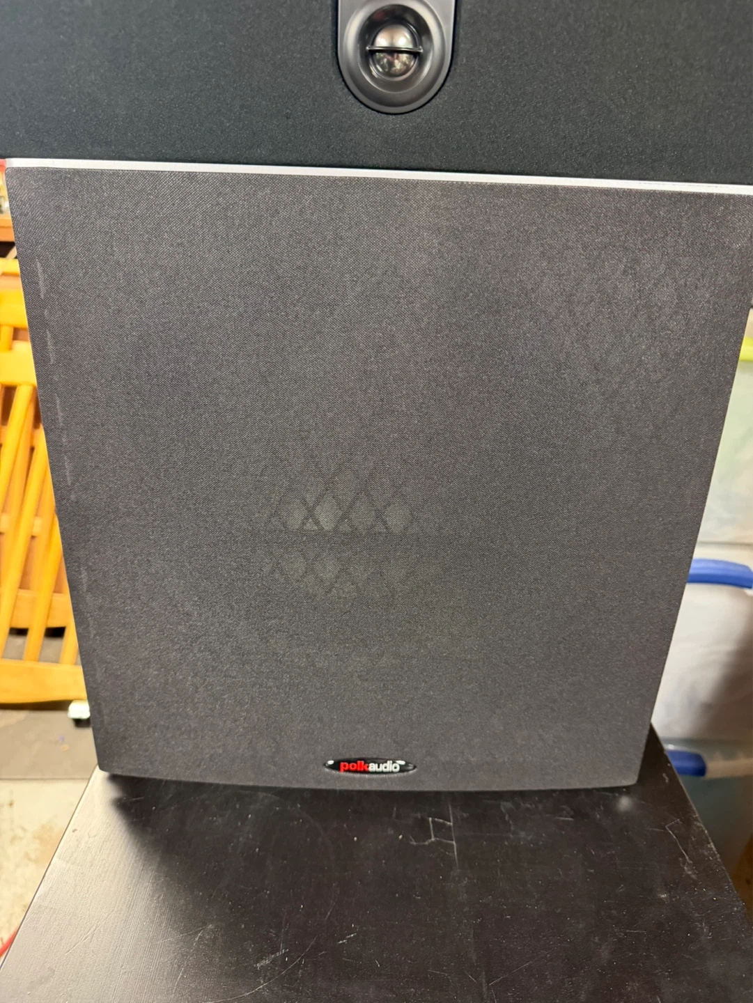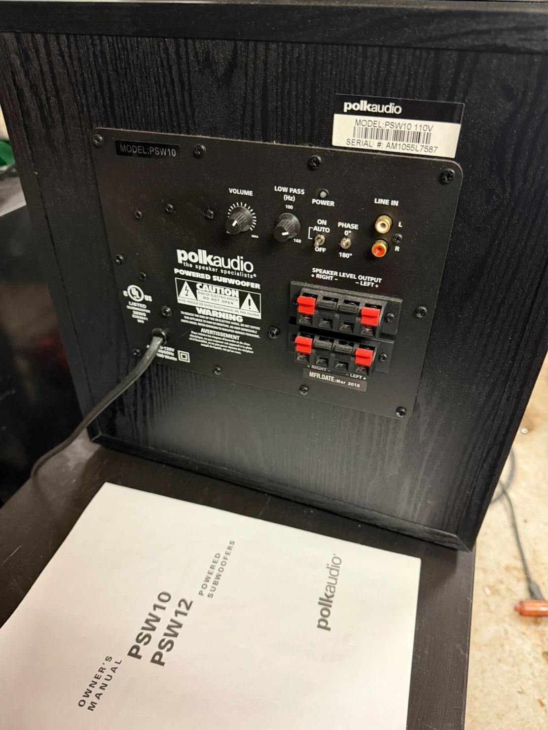 This is a Polk Audio PSW10 powered subwoofer. It has a black cabinet and a dark grey grille. Includes owner's manual. Manufactured May 2018.