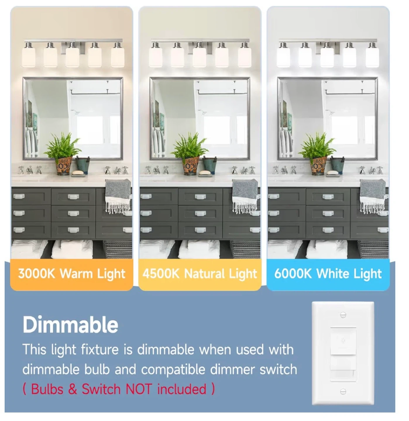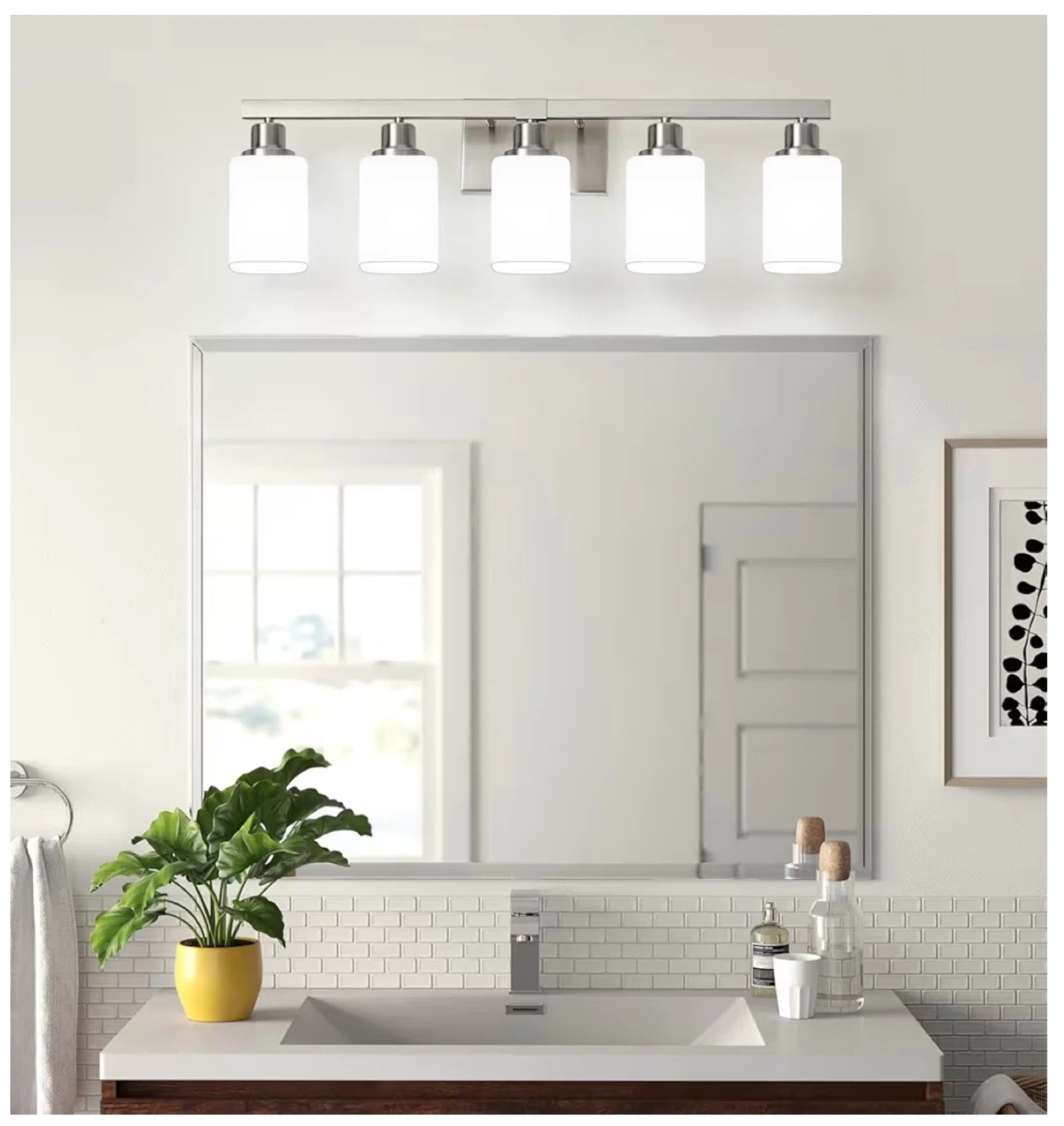This vanity light fixture features a brushed nickel finish and frosted glass shades. It's designed for E26 base bulbs, with a maximum of 60W per bulb. Bulbs are not included. Measures 29.90in L x 5.75in W x 9.06in H. It can be installed facing up or down.