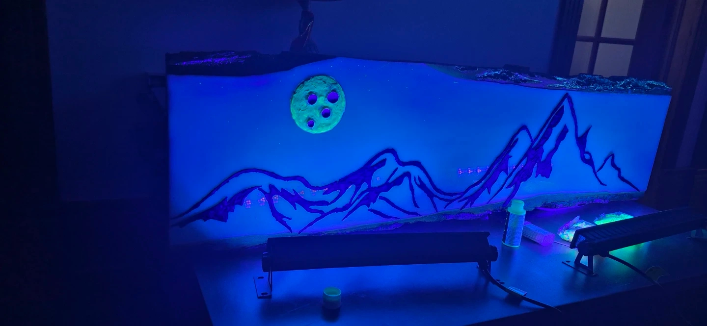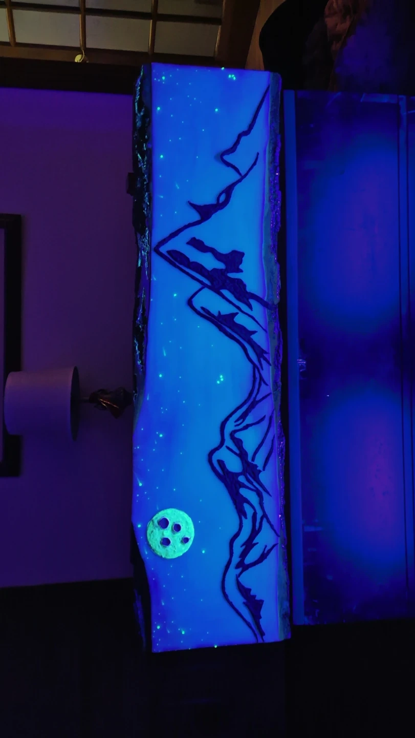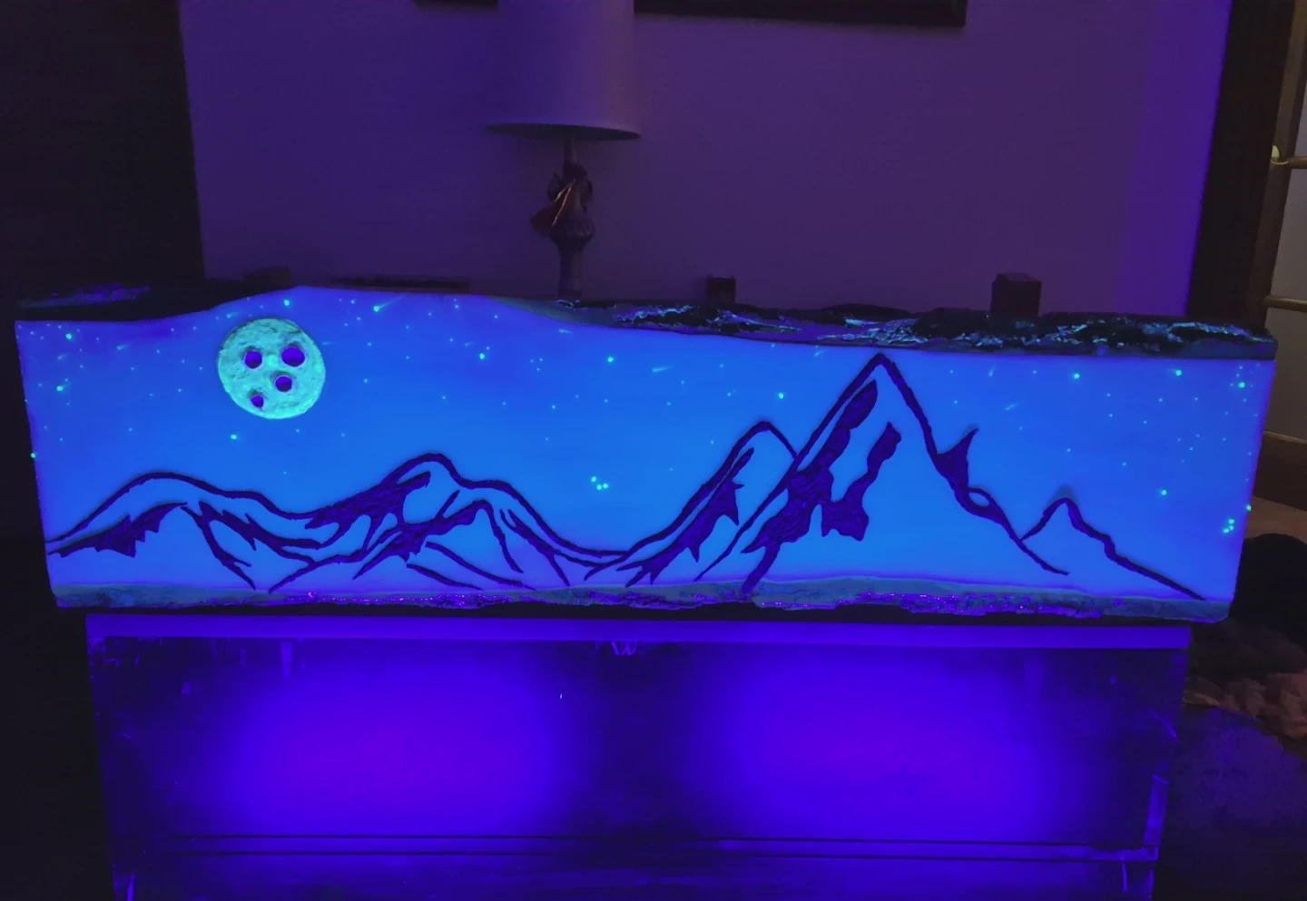This handmade resin desk lamp features a stunning mountain range under a starry night sky, with a unique moon detail. It's illuminated by a bright blue light, creating a captivating ambiance. It's perfect for adding a touch of art and wonder to any room! ...