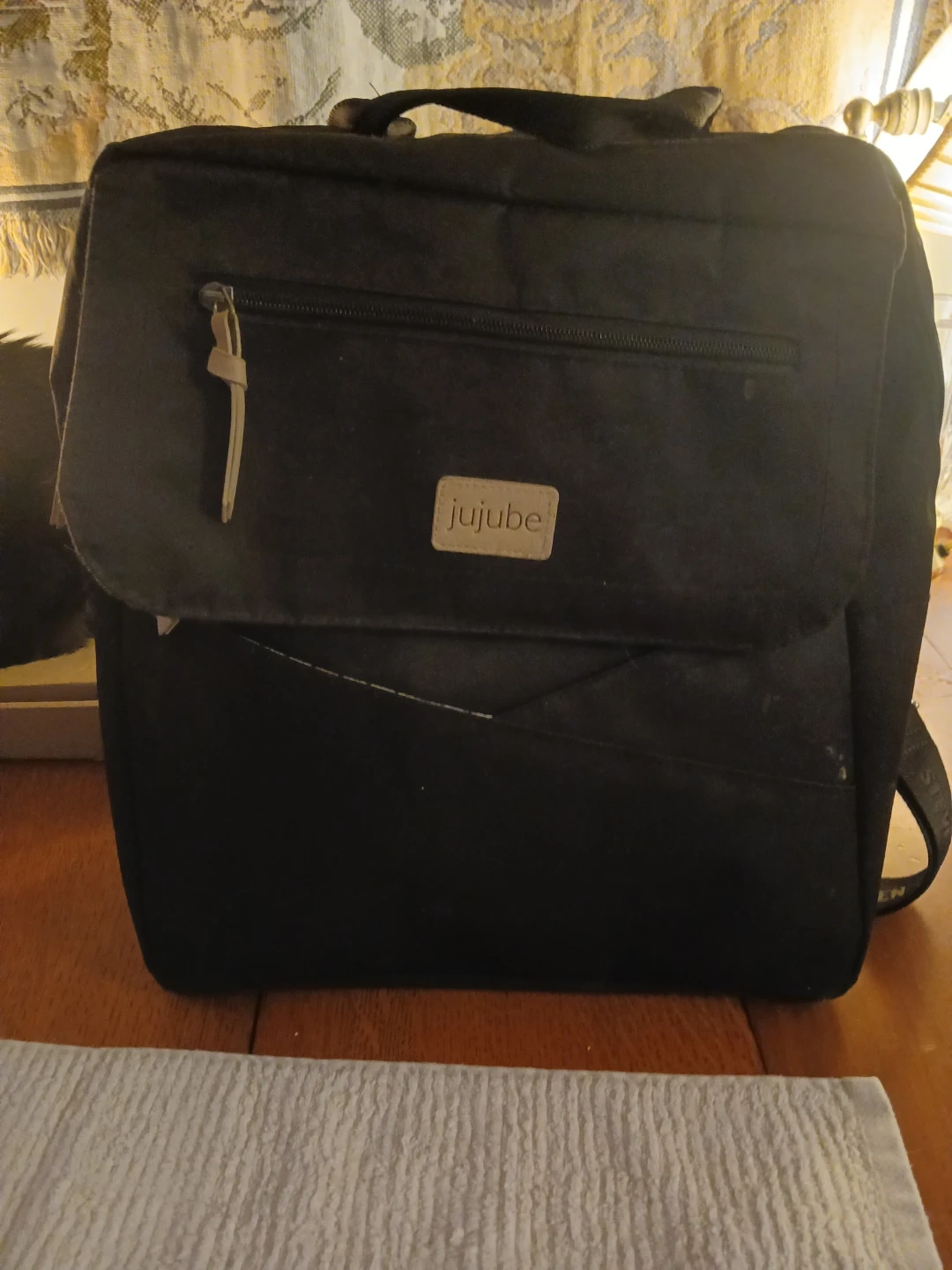 This is a black Jujube backpack. It features multiple interior pockets for organization. It's great for carrying essentials for a day out.