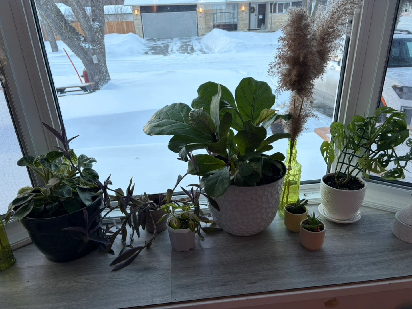 Collection of various indoor plants in decorative pots. They're suitable for adding some green to your home. Includes a large fiddle-leaf fig, a striped prayer plant, and smaller succulents. All real.