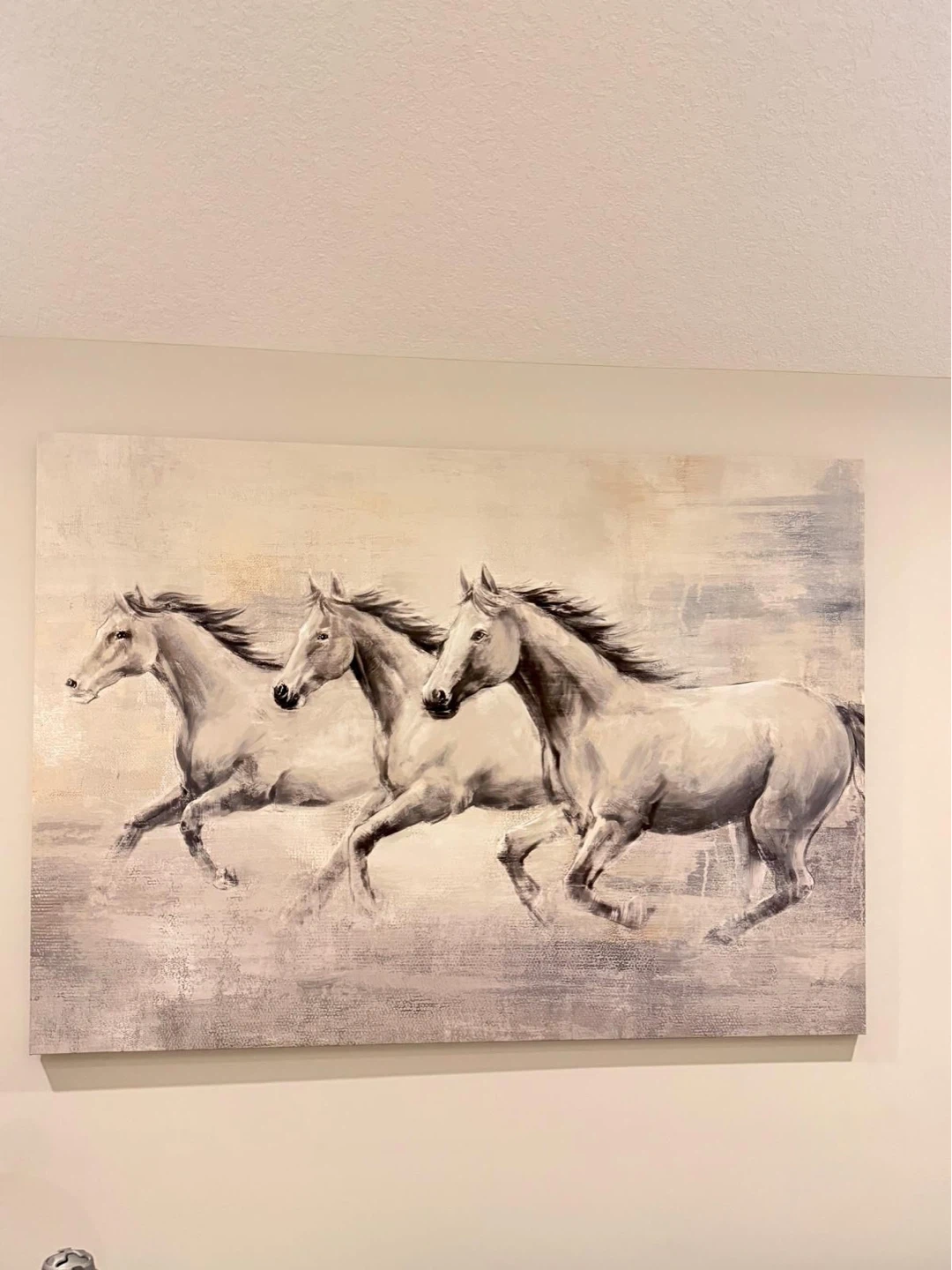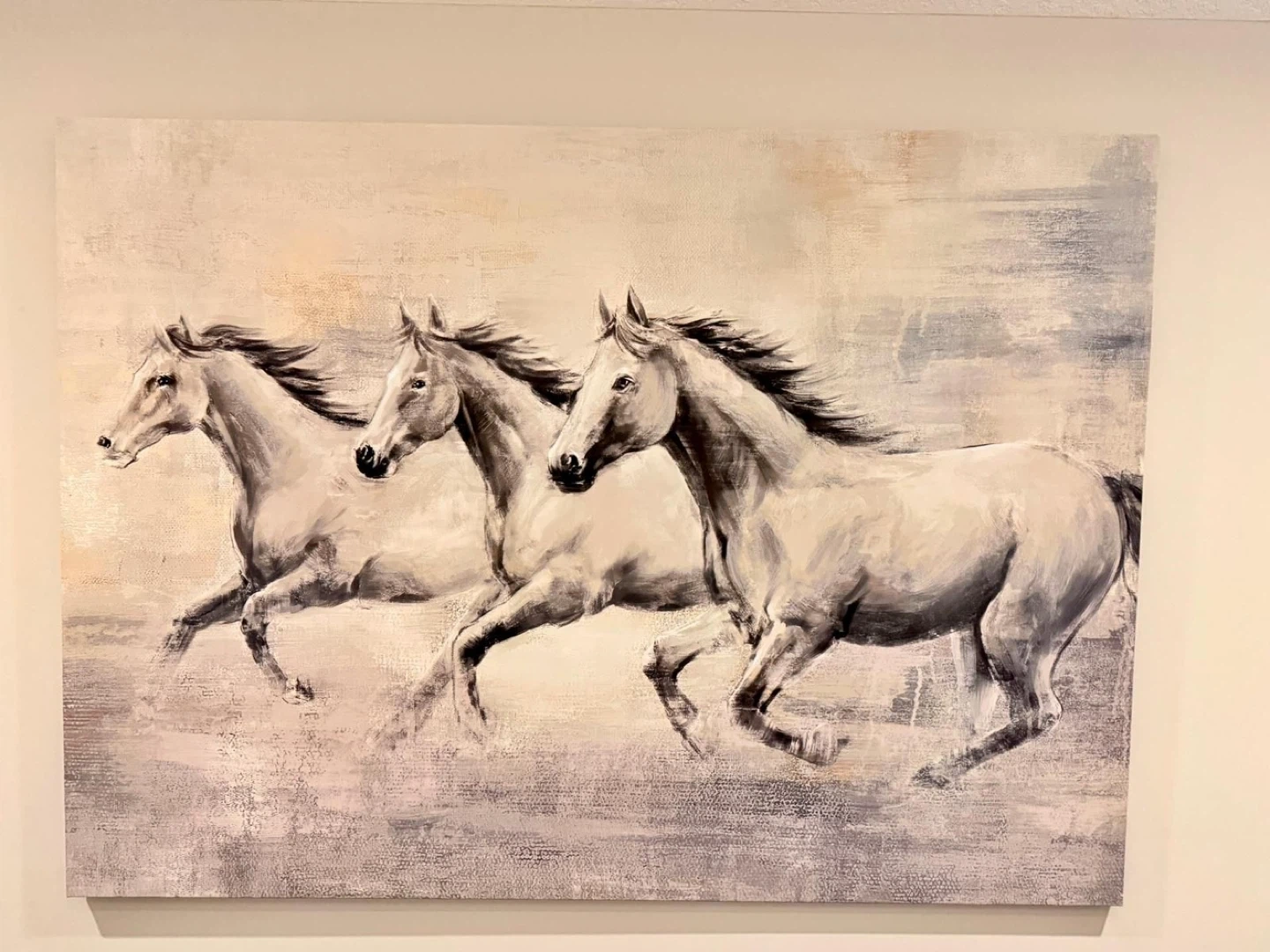 Beautiful canvas print featuring three horses galloping across a landscape. The artwork has a neutral, desaturated colour palette, making it a versatile piece for various decors. It's ready to hang and add a touch of natural elegance to any room.