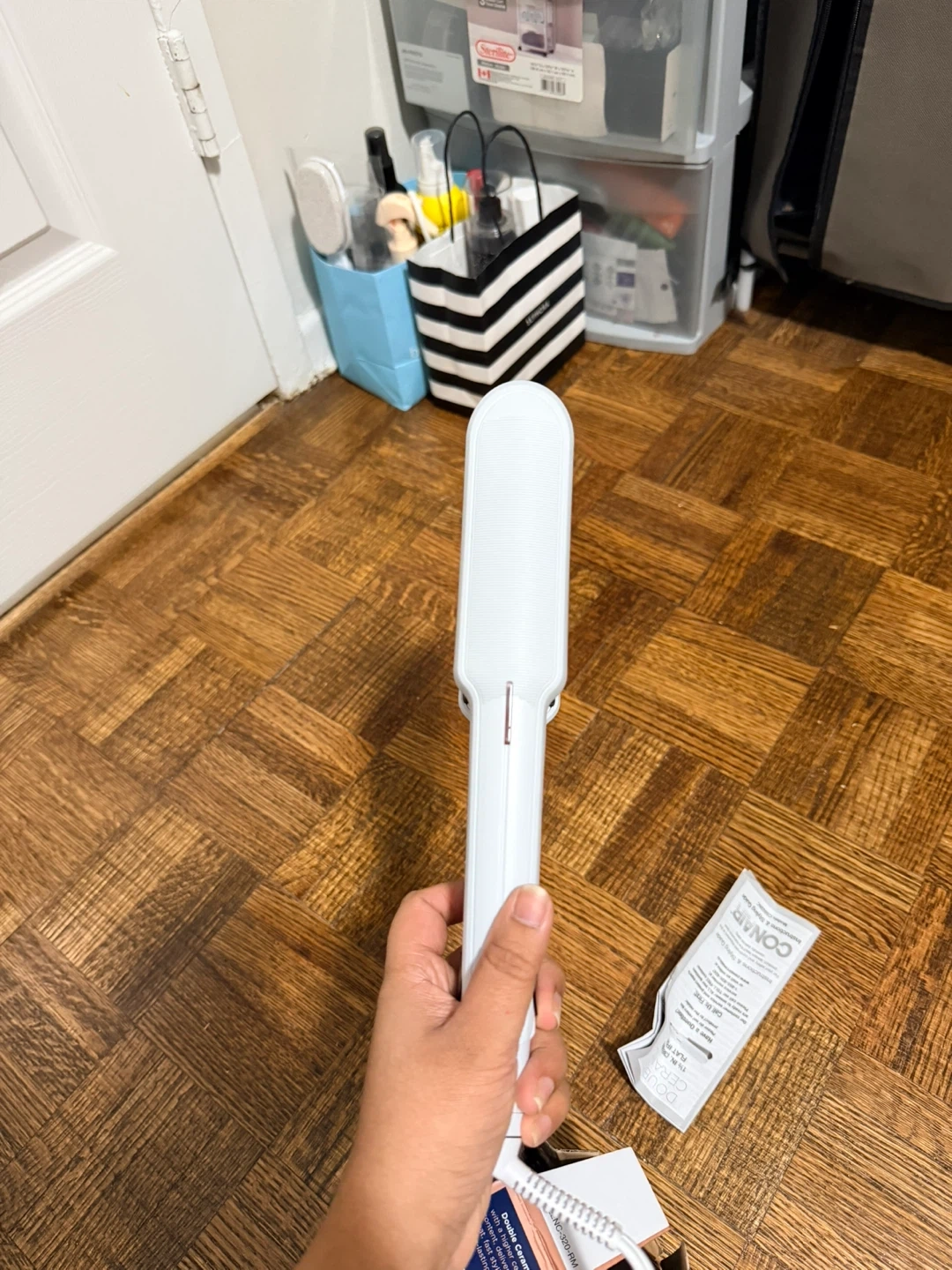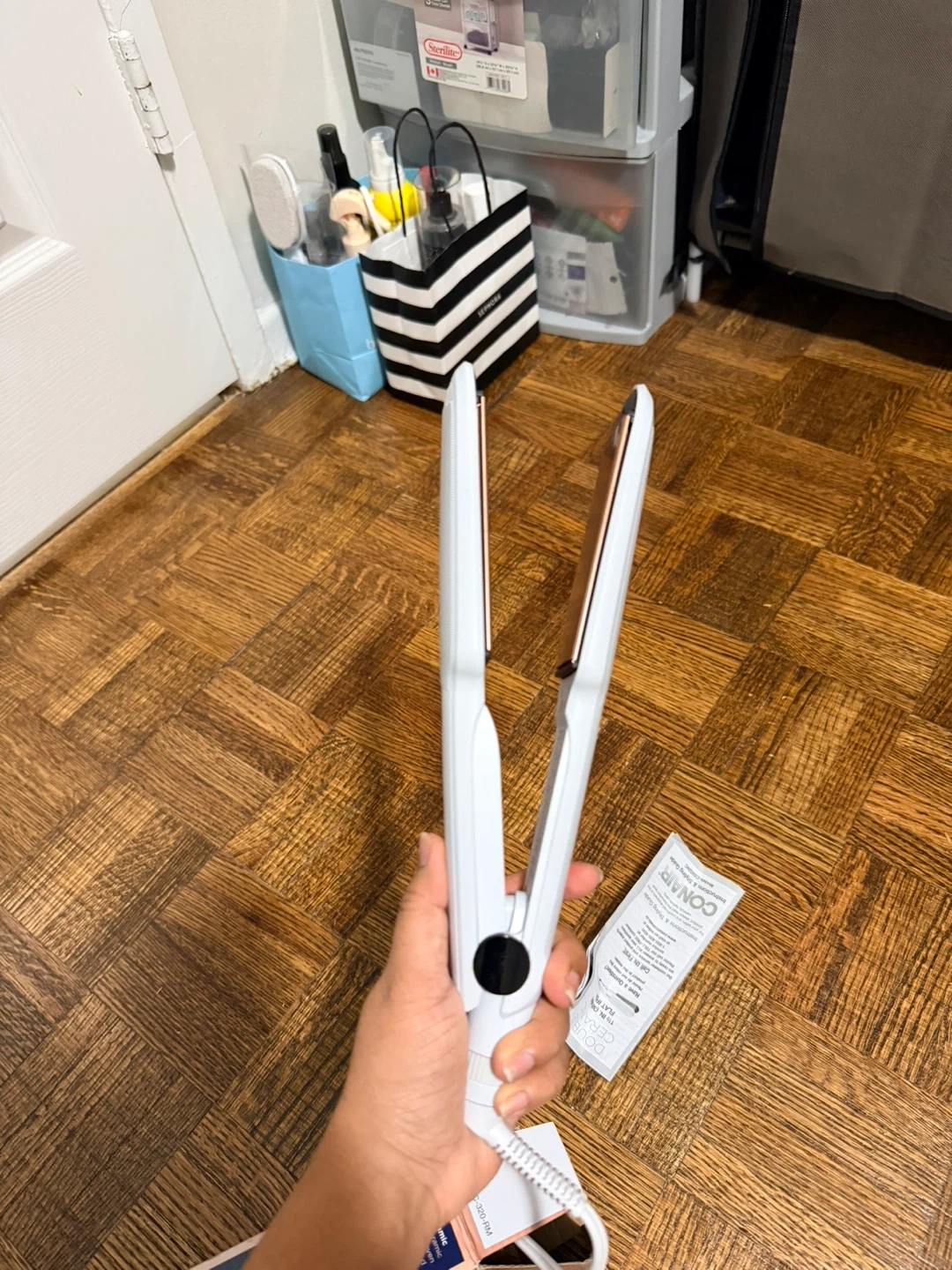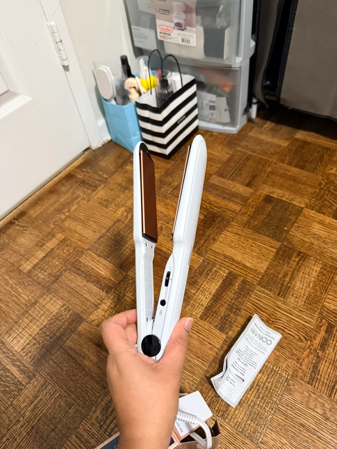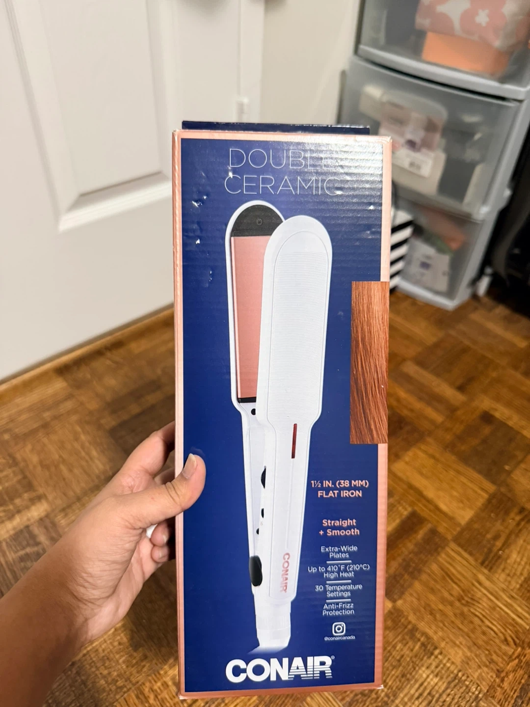 Get straight and smooth hair with this Conair Double Ceramic flat iron. It features 1 1/2 inch (38 mm) extra-wide plates and heats up to 410°F (210°C) with 30 temperature settings. Anti-frizz protection is included. This flat iron is good for achieving sleek hairstyles at home.