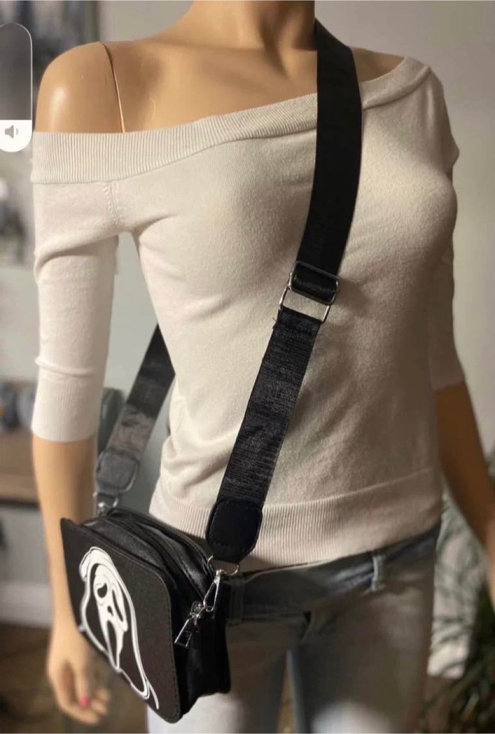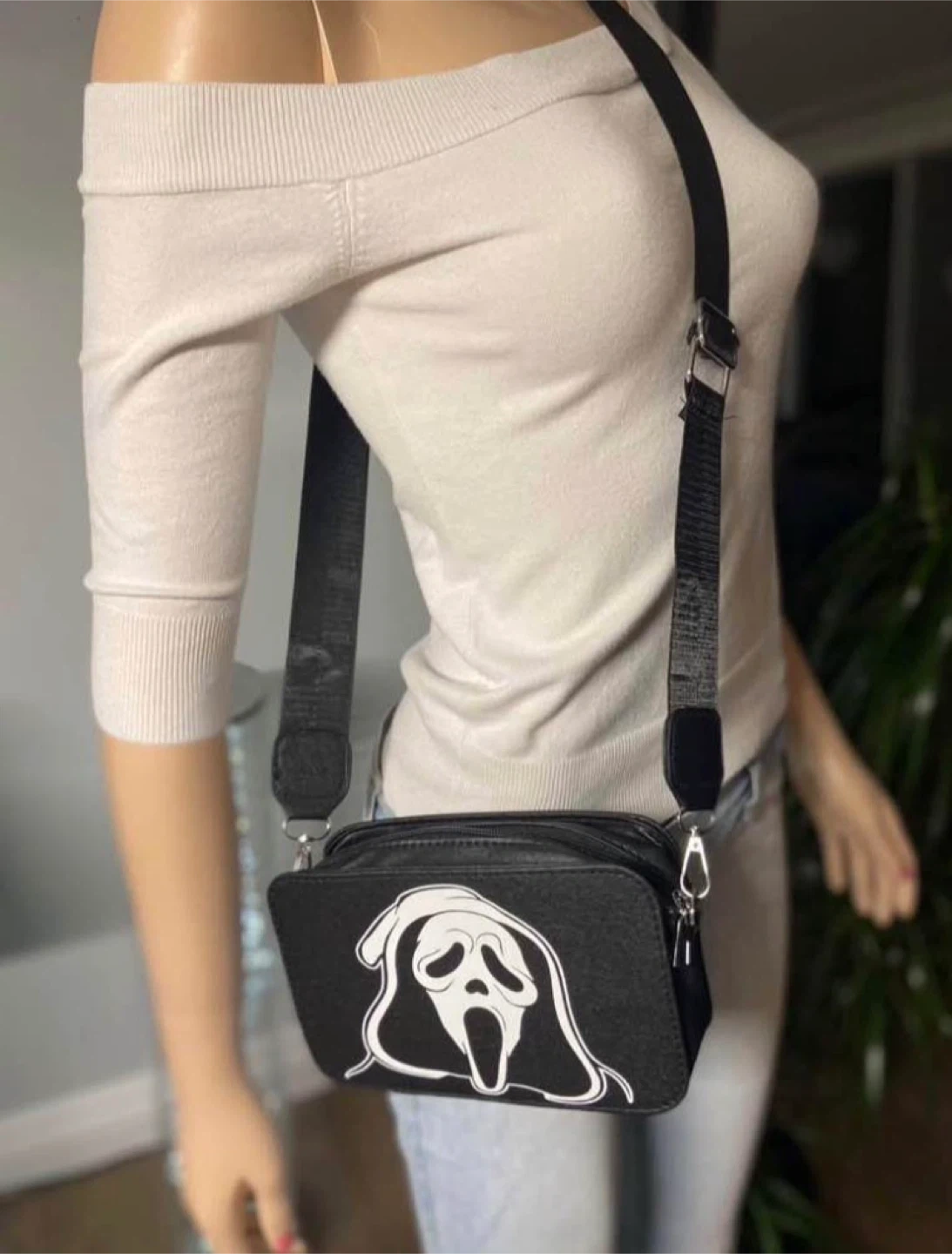 Black crossbody bag featuring the iconic Ghostface mask design from Scream horror movie franchise