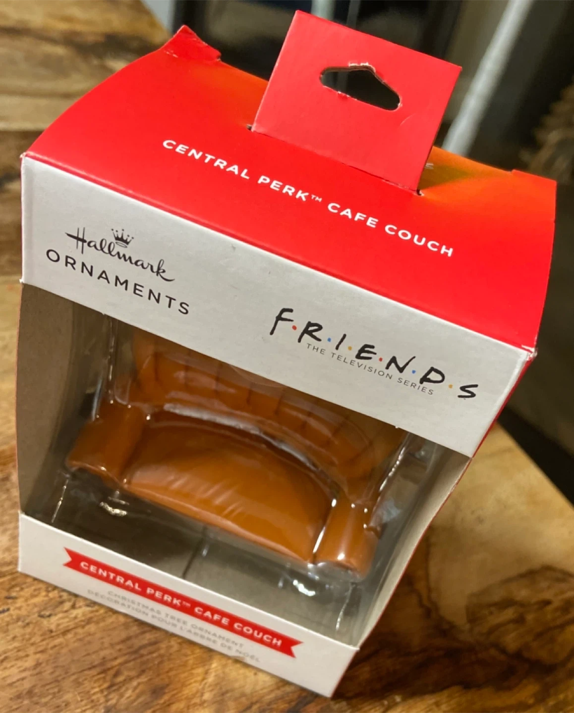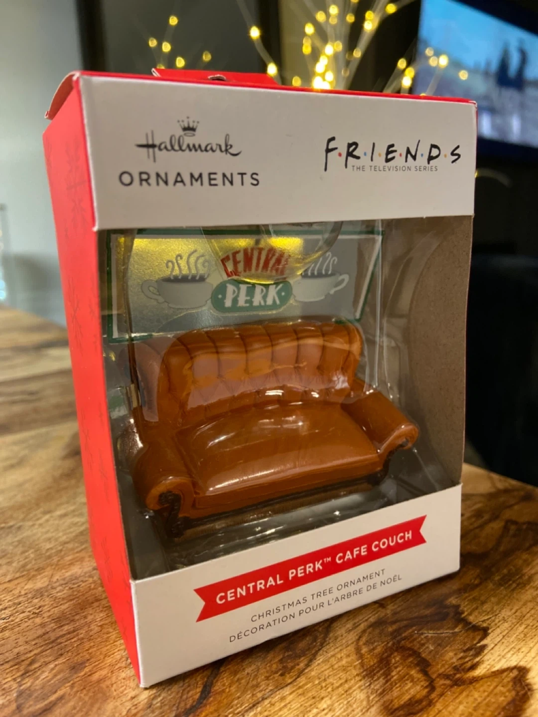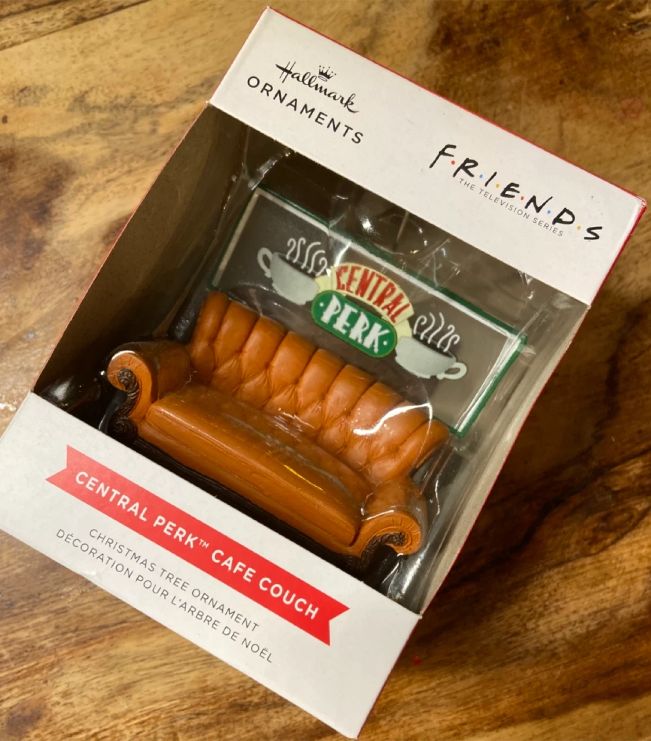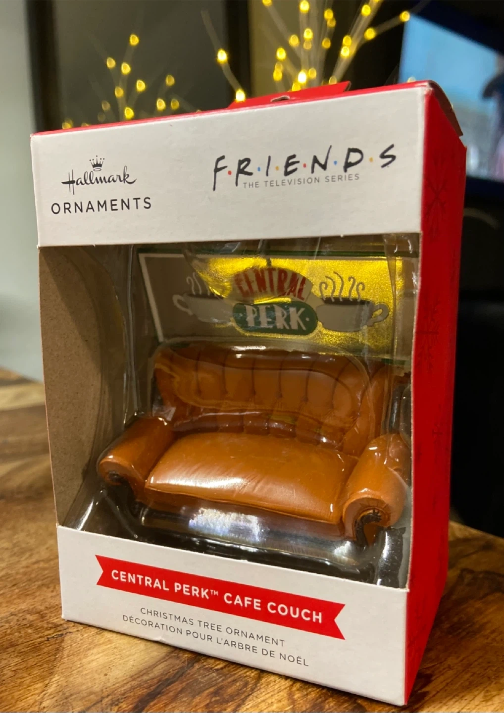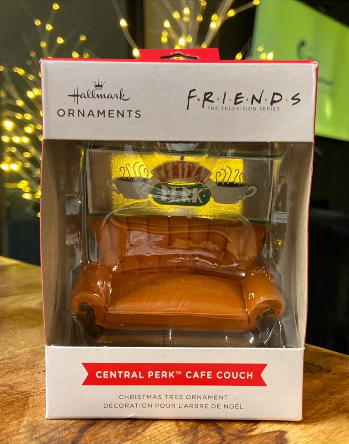 This is a Hallmark ornament featuring the iconic Central Perk couch from the TV series Friends. It's a great addition for any fan's Christmas tree!