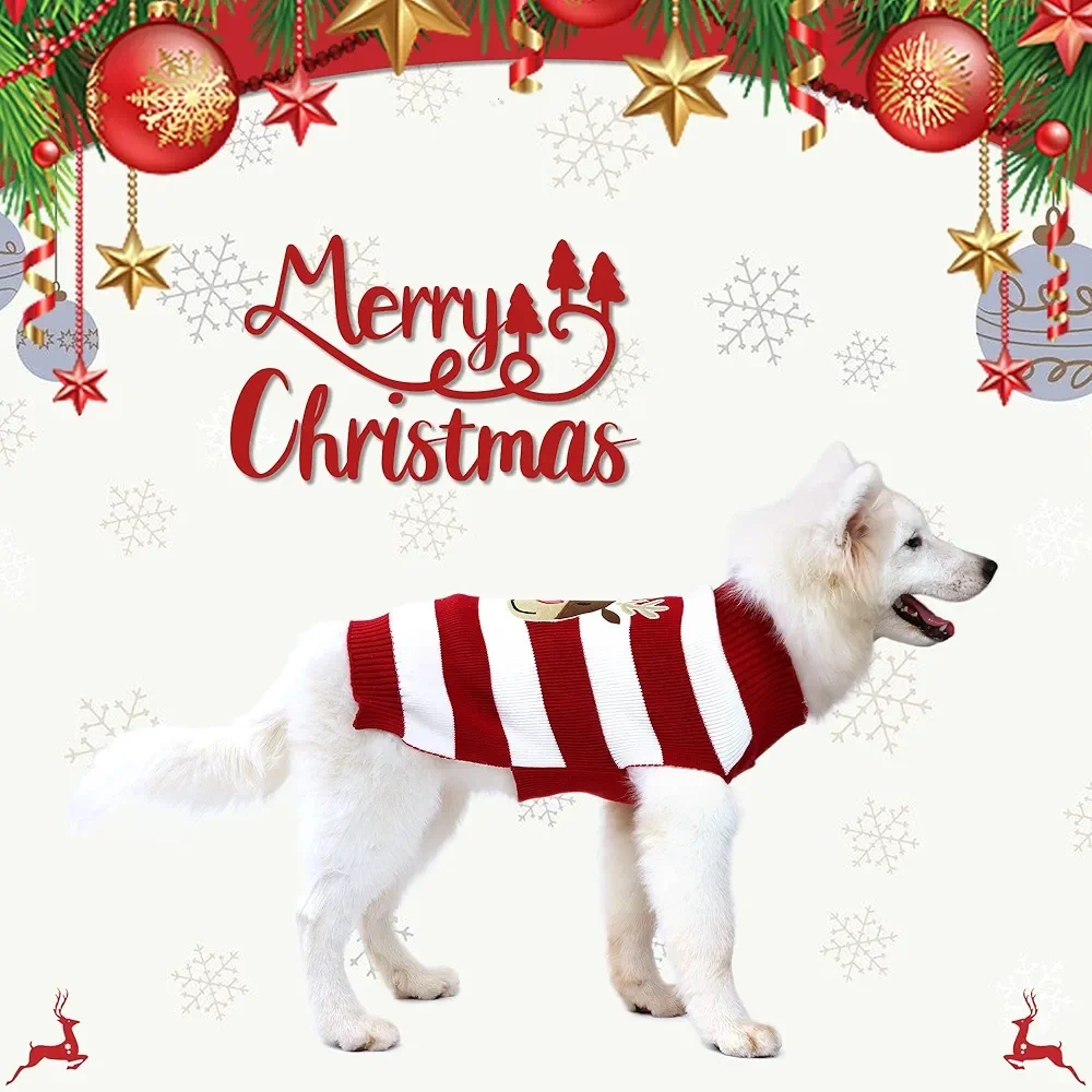 Keep your furry friend cozy and festive with this adorable red and white striped dog sweater. It features a cute embroidered elk head on the back and a high neck design for extra warmth.