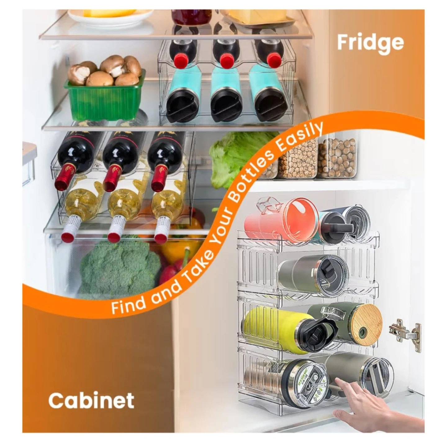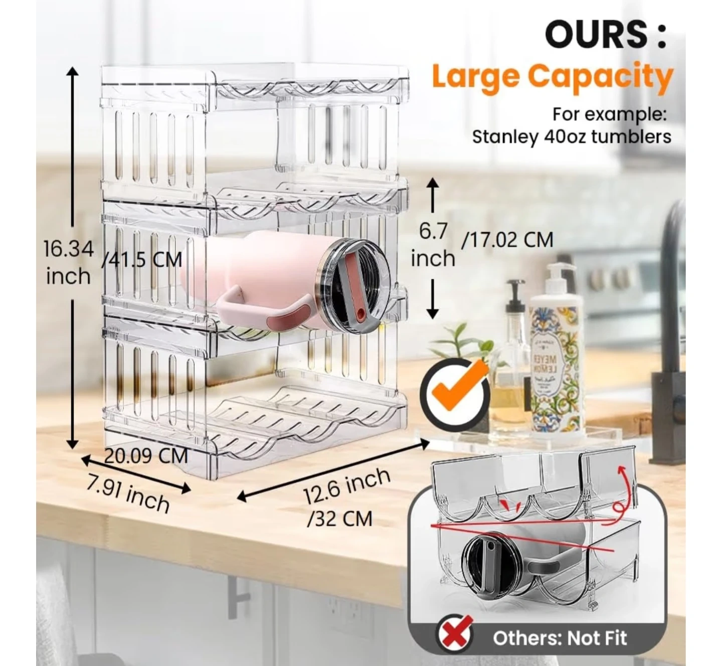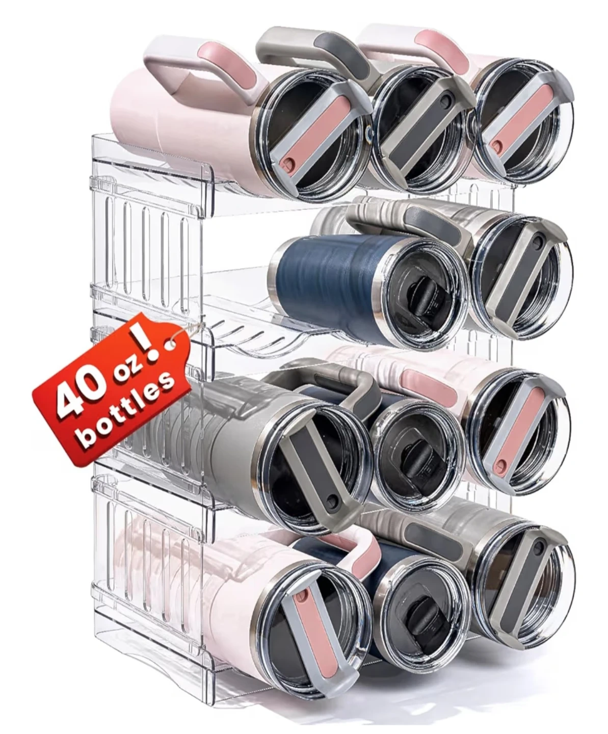 This 4-tier stackable organizer is perfect for keeping your 40oz bottles neat and tidy! It holds four bottles per tier and can be used in a fridge or cabinet. The clear design makes it easy to see your bottles. It measures 16.34 inches high and 7.91 inches wide.