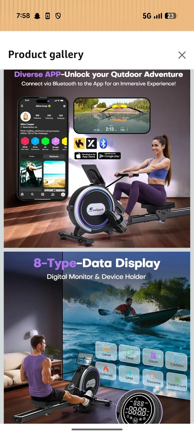 Connects via Bluetooth to an app for an immersive experience. Features a digital monitor with 8-type data display and a device holder. It has 32 levels of magnetic resistance and a 12 LBS flywheel. Maximum weight capacity is 180KG.