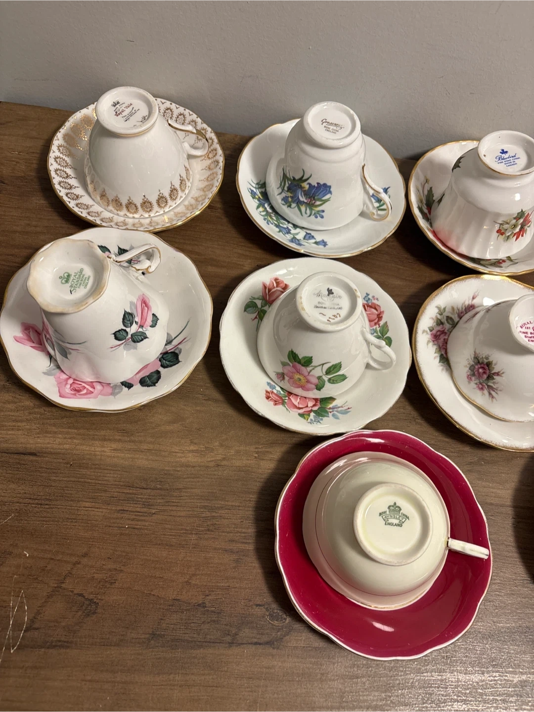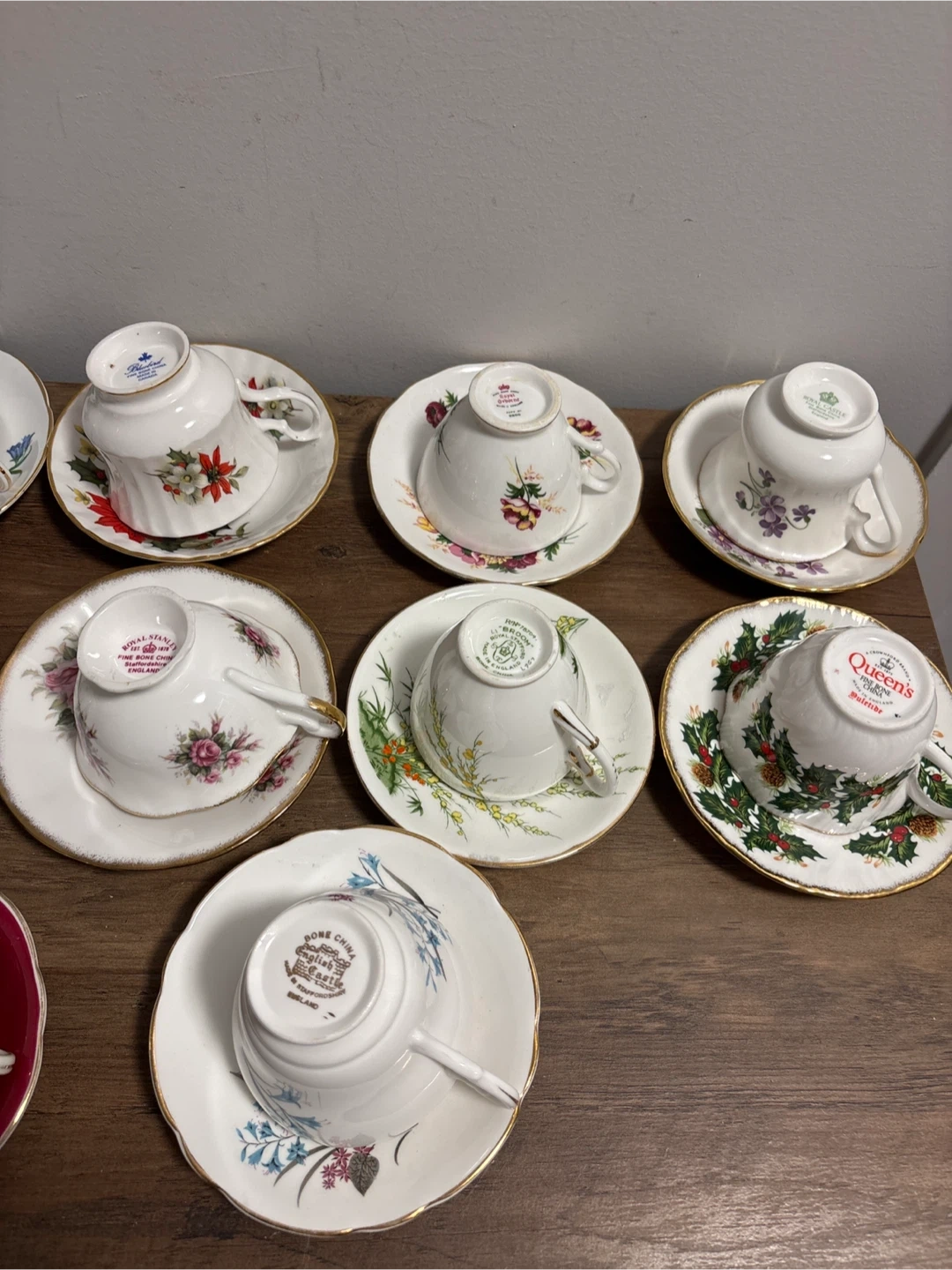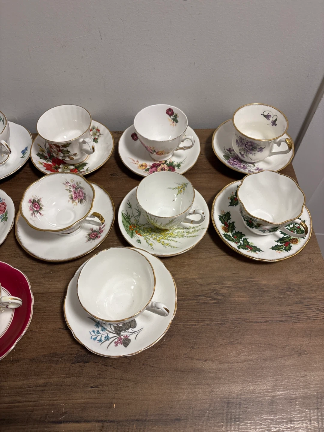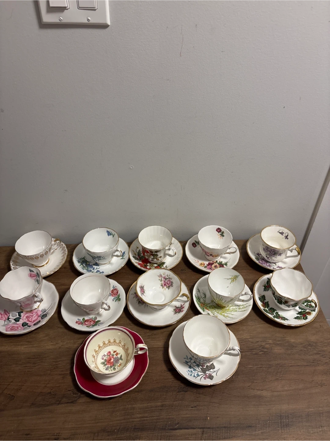 This is a collection of twelve assorted vintage teacups and saucers, featuring various floral designs. Each cup and saucer is made of fine china and England and one from Canada. They're great for adding a touch of elegance to your afternoon tea or for display!