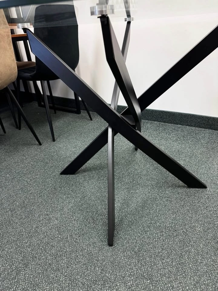 Elevate your dining space with this modern glass table featuring a high-gloss 9mm tempered top and strong metal criss-cross legs for a luxurious look.
