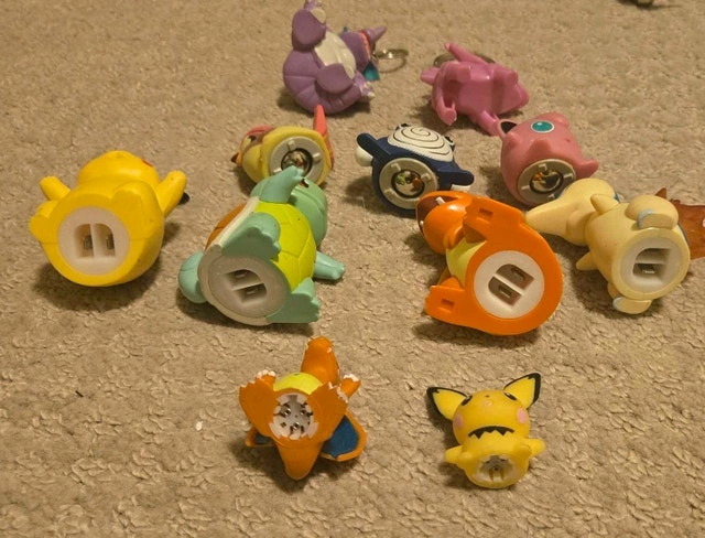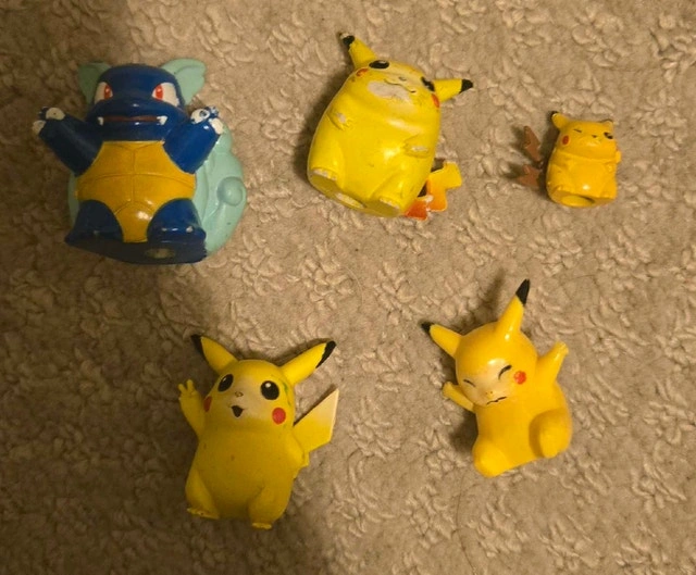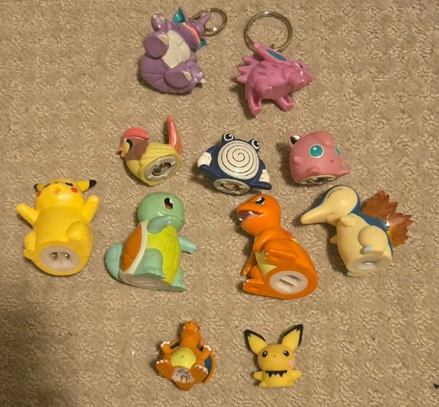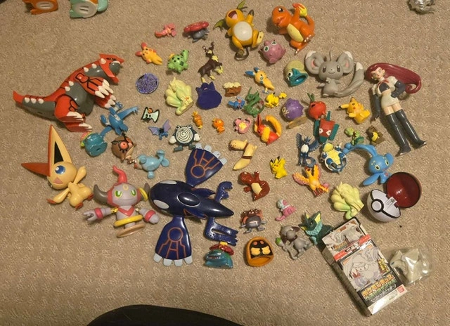 Assortment of Pokemon items for sale. Some figurines are third-party with less detailed paint jobs, while others are brand name. Some figures have special bases or rolling balls, and there are also keychains included. Located in Stony Plain. Can meet in Millwoods on weekdays around 3:45 PM or at the Stony Plain Road Walmart around 4 PM. Inquiries asking 'is it available' will not receive a response.