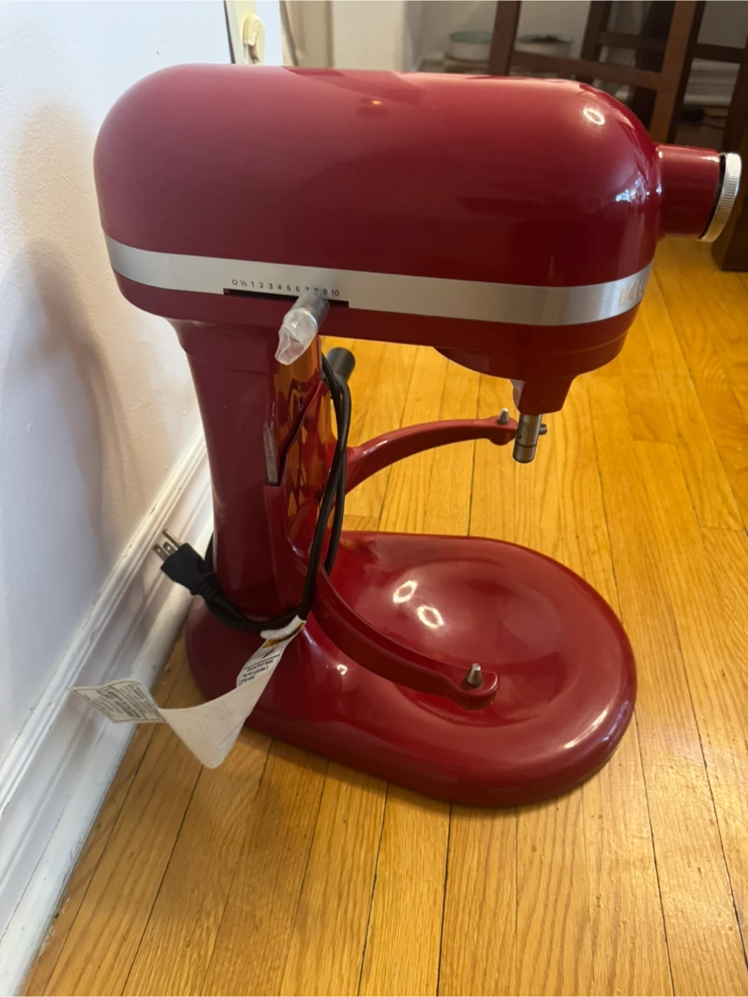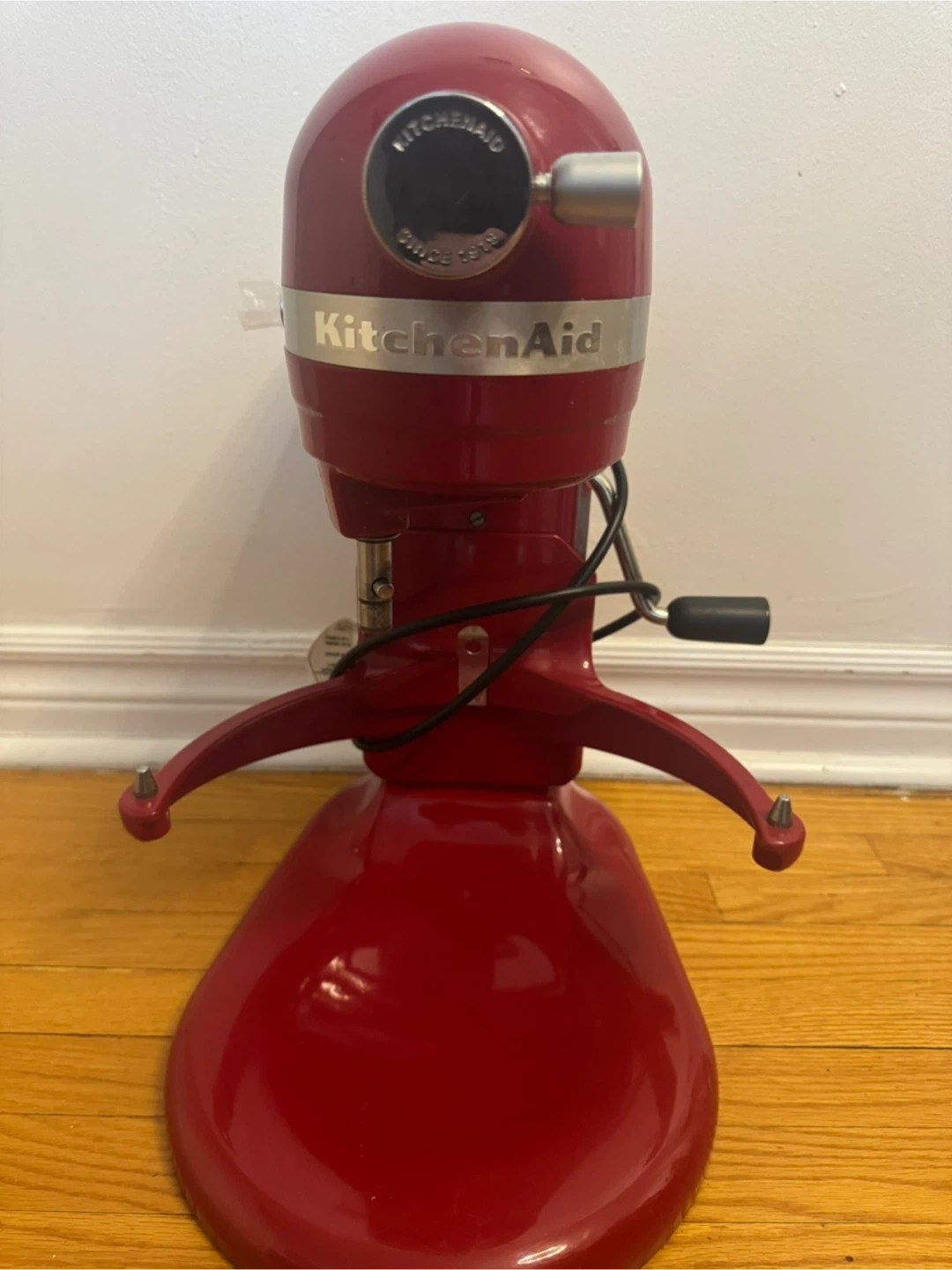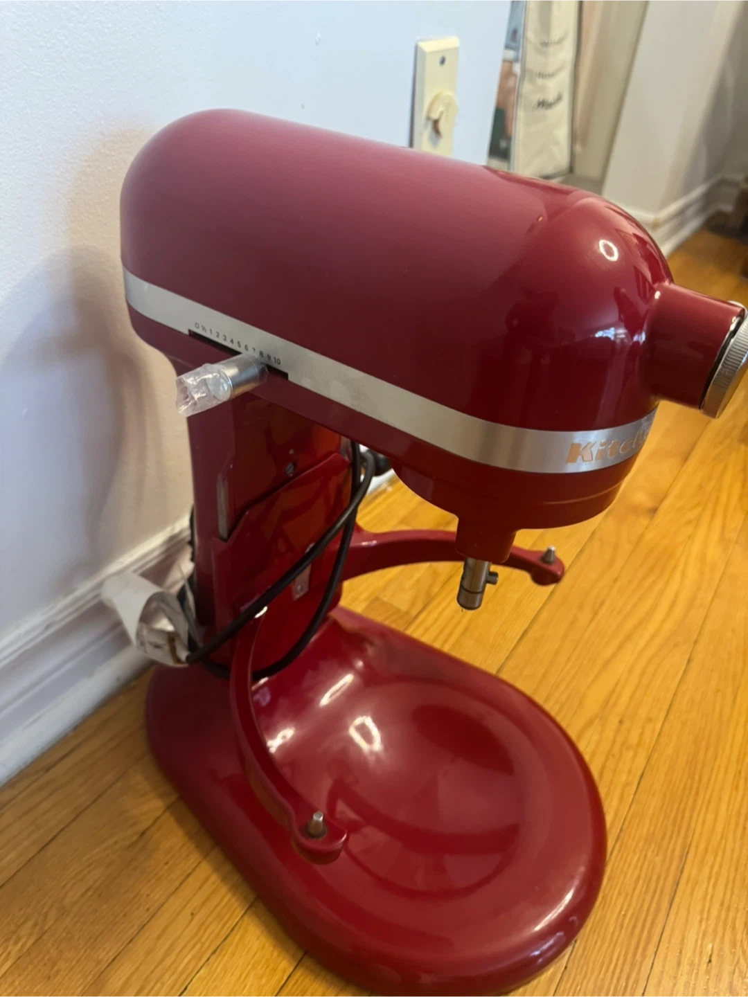 This is a red KitchenAid stand mixer. It comes with a stainless steel bowl and attachments. It's in good condition and ready for your kitchen! Has 10 speed