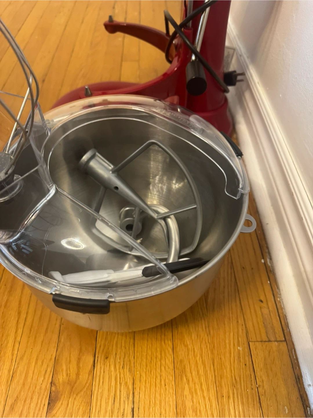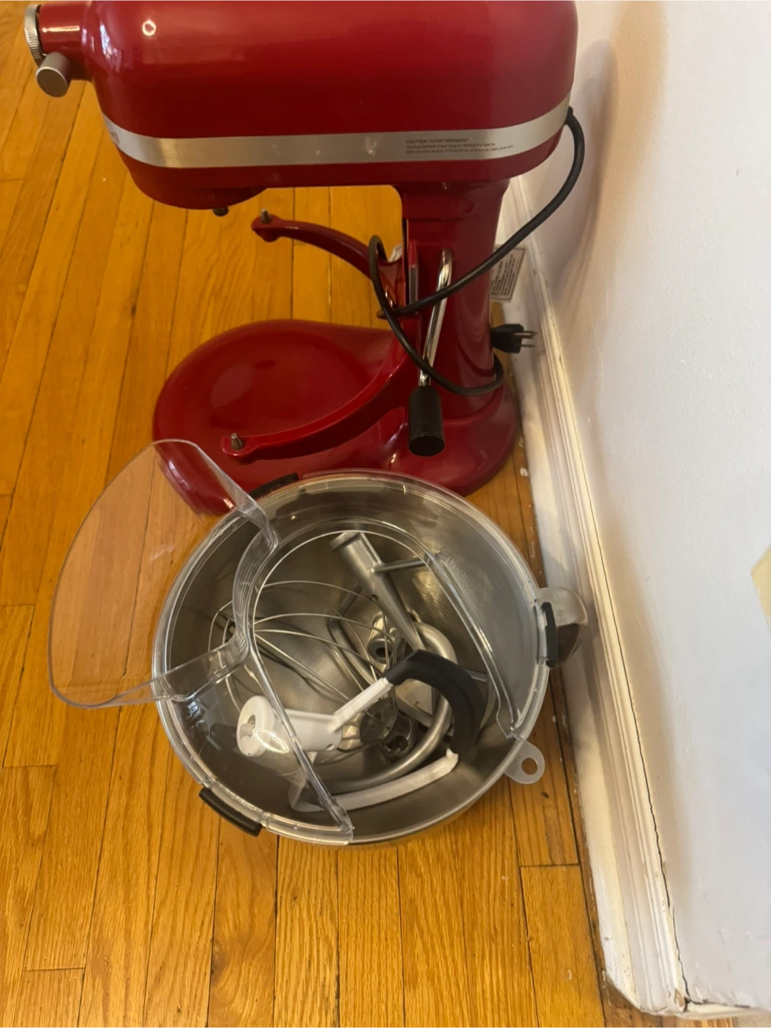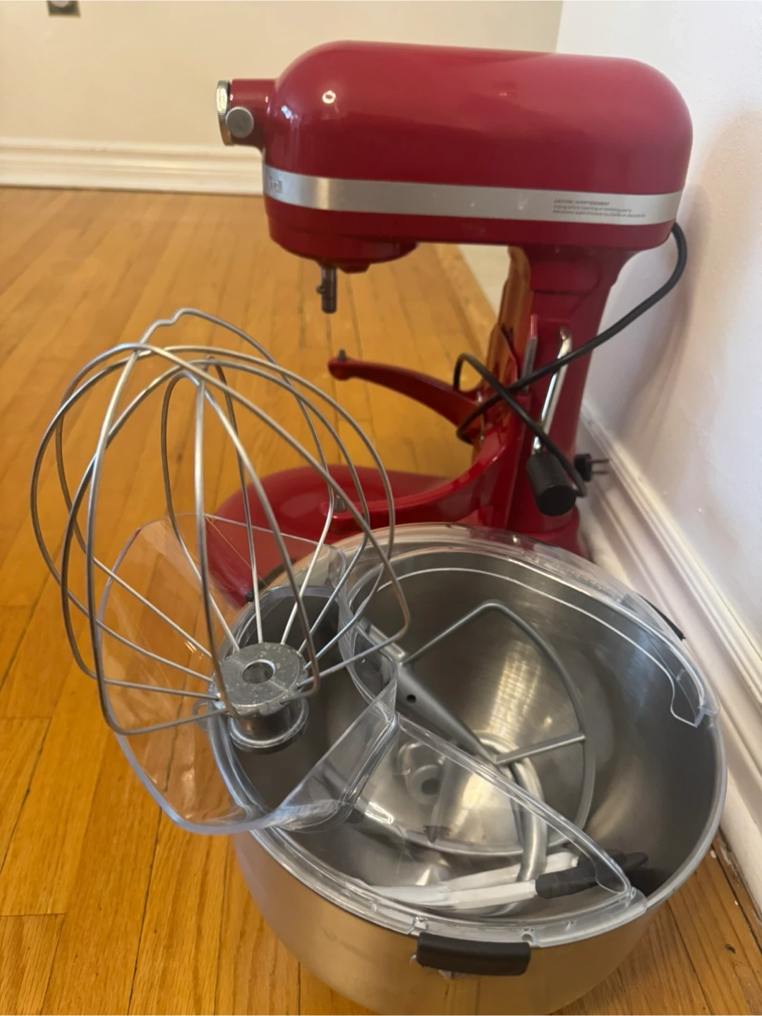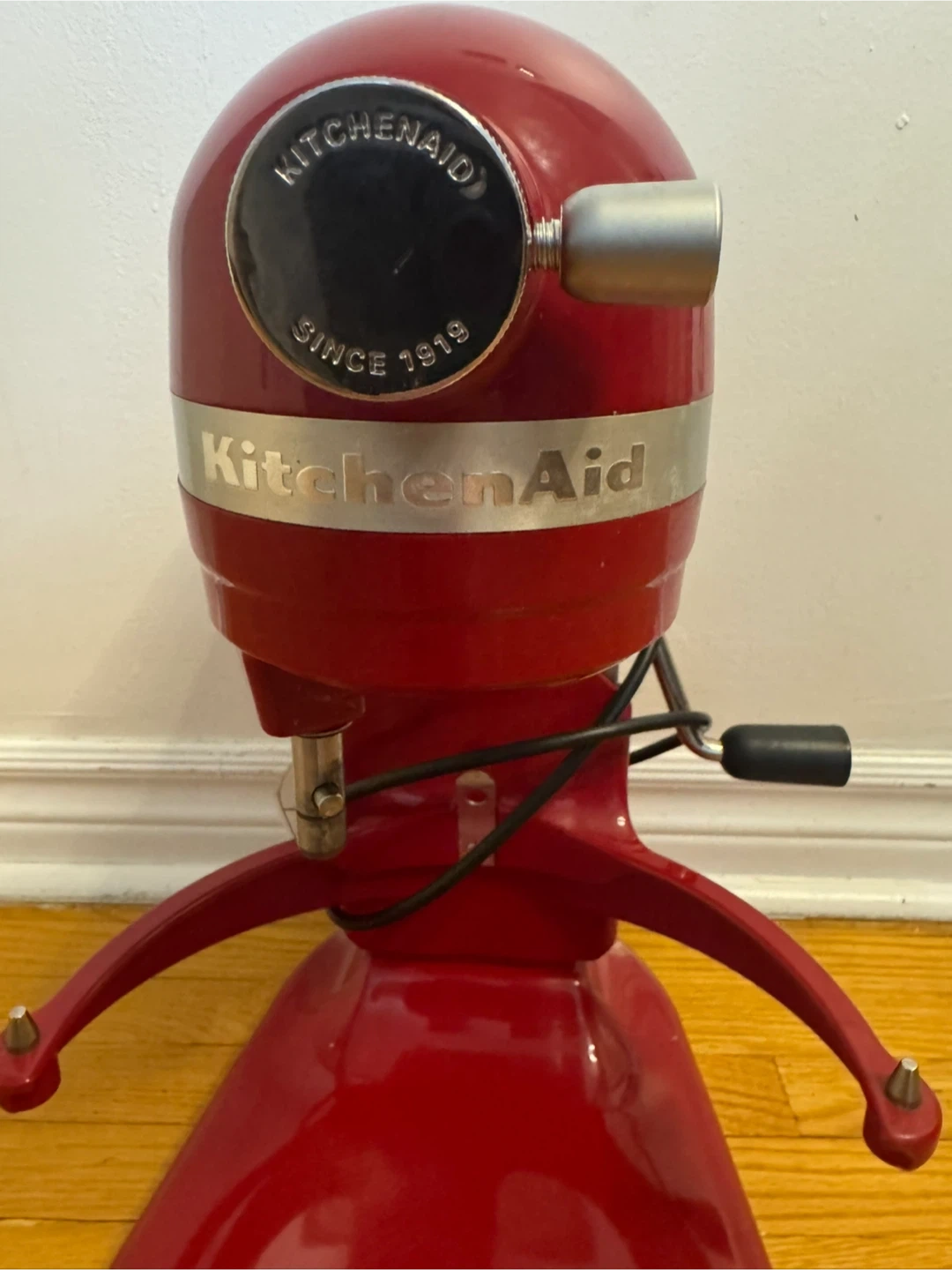 This is a red KitchenAid stand mixer. It comes with a stainless steel bowl and attachments. It's in good condition and ready for your kitchen! Has 10 speed
