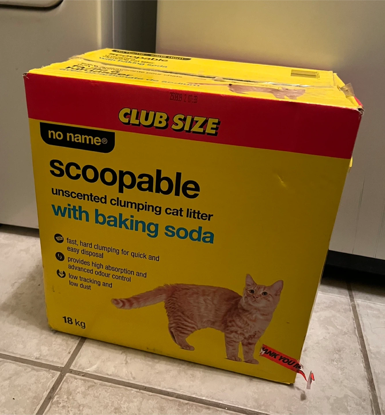 This No Name brand scoopable cat litter is unscented and contains baking soda. It offers fast clumping for quick and easy disposal. Provides high absorption and advanced odour control, with low tracking and low dust. This club size box contains 18 kg of litter. new sealed