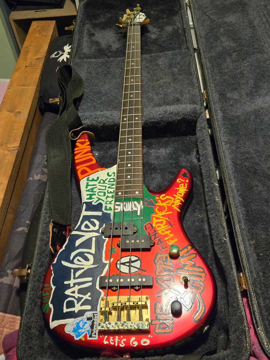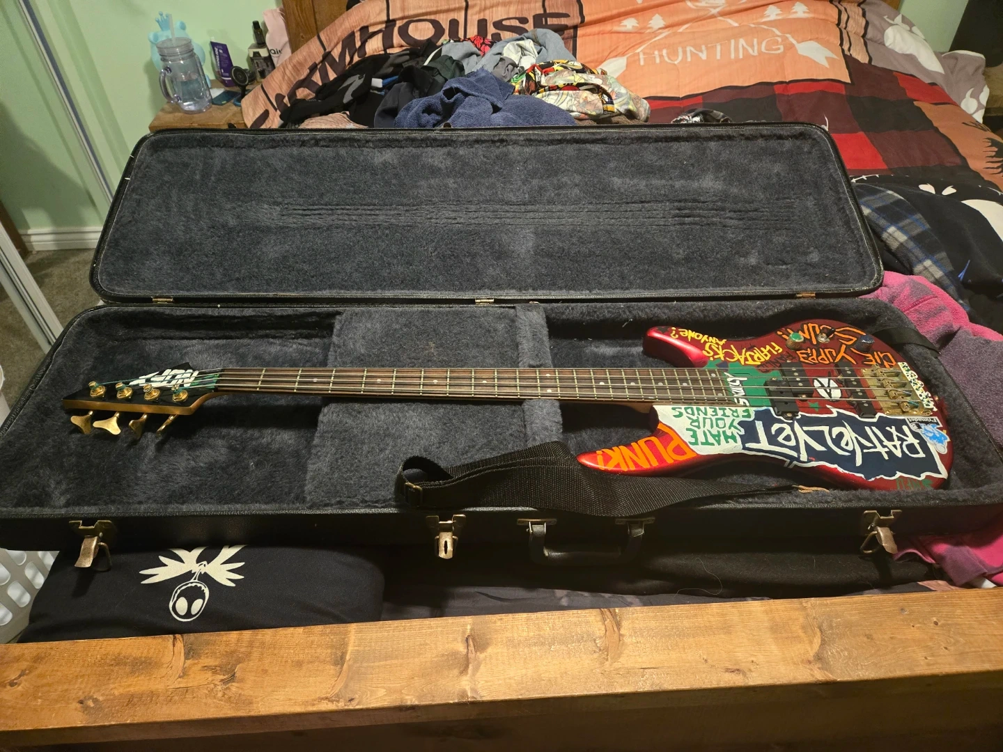 This is a H.U.F. bass guitar with a custom punk art design. It's in a hard case and includes a strap. The fretboard is smooth and the hardware is gold-toned.