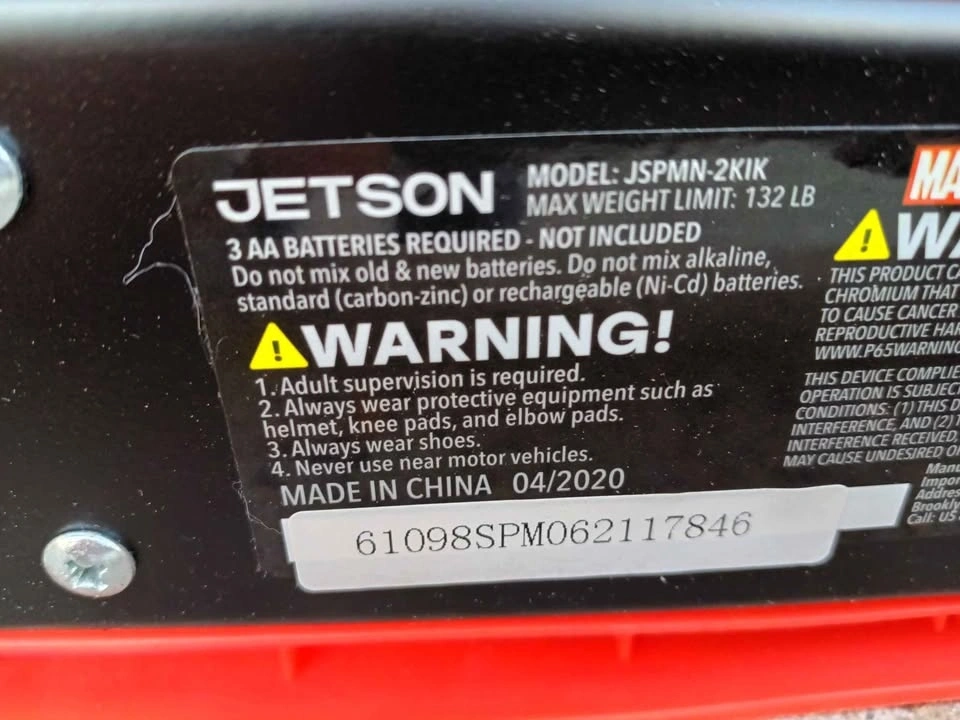 Lightweight Jetson kick scooter with a red and blue Spider-Man design. It features a folding frame for easy storage and transport. This model includes a battery-operated LED light-up deck with multiple patterns. It has a height-adjustable handlebar with white grips and a rear foot brake. The maximum weight limit is 132 lbs.