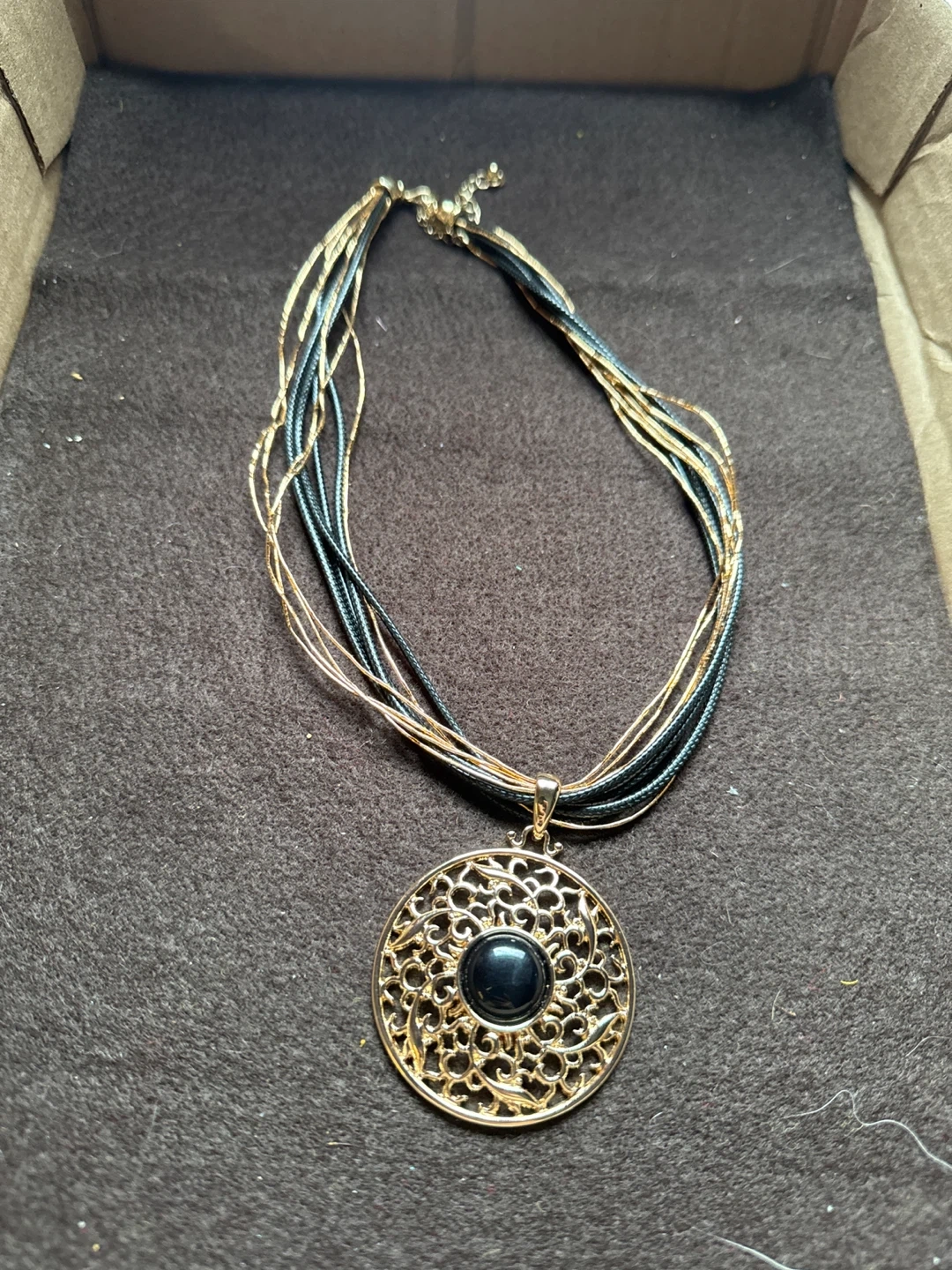 This multi-strand necklace features a gold-tone filigree pendant with a black stone accent. It's crafted with a mix of gold and black cords for a layered look. It has an adjustable clasp for a comfortable fit.