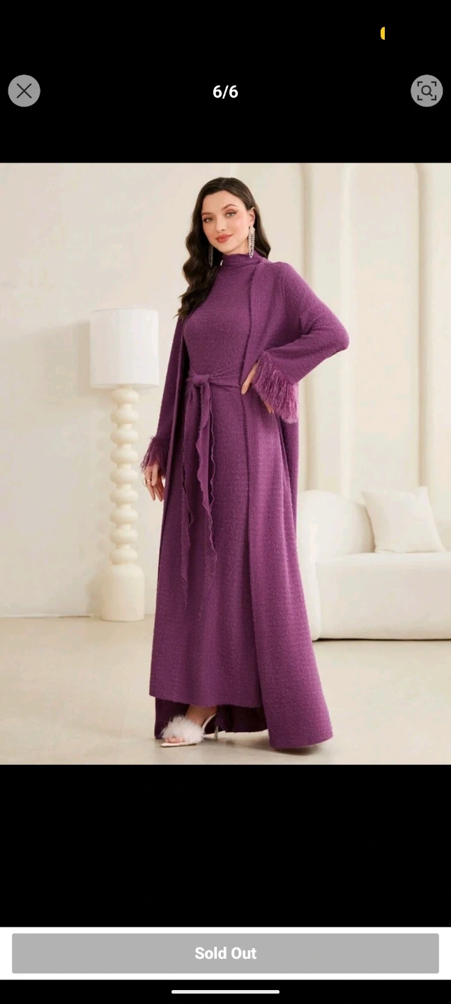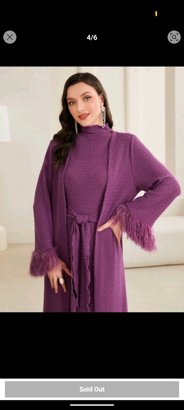 This includes a long purple knit dress long-sleeved cardigan. The cardigan features decorative feather trim on the cuffs for a touch of flair. It's made from a textured knit material. It's a stylish option to throw on for an evening out or special occasion!