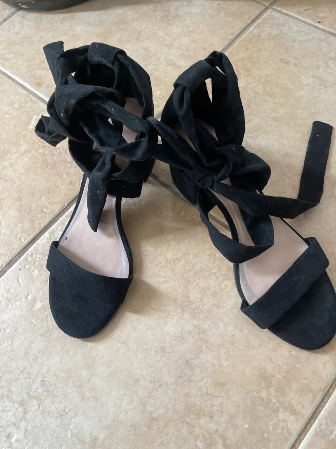 These black sandals have a suede-like finish and feature tie-up ankle straps. They're flat sandals, perfect for a casual look. A simple design for everyday wear!