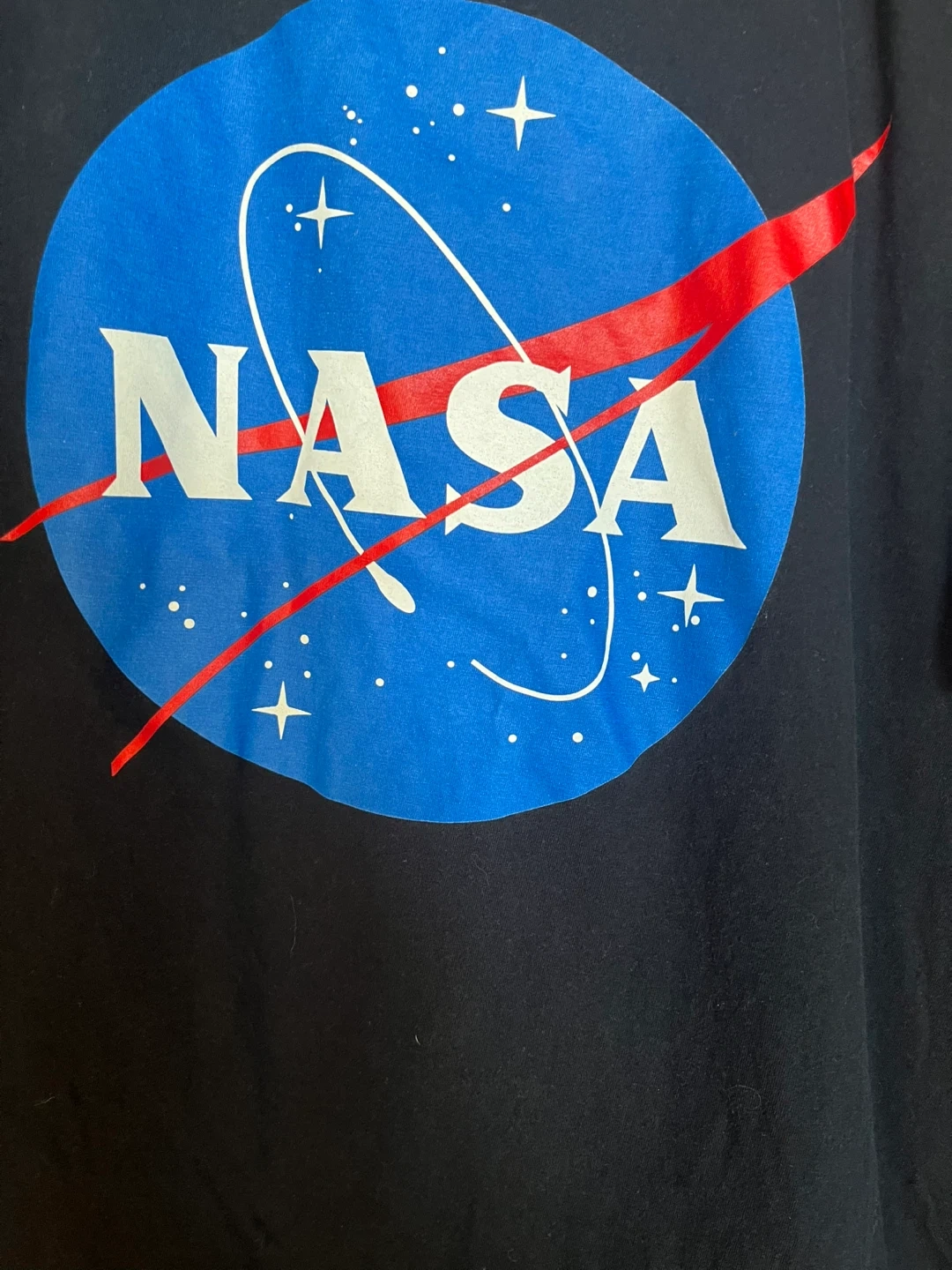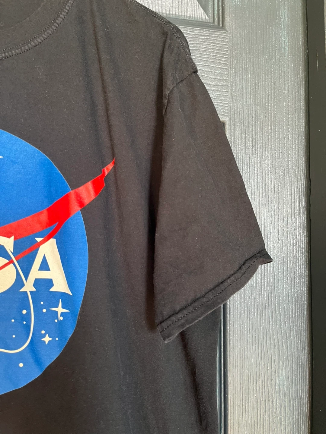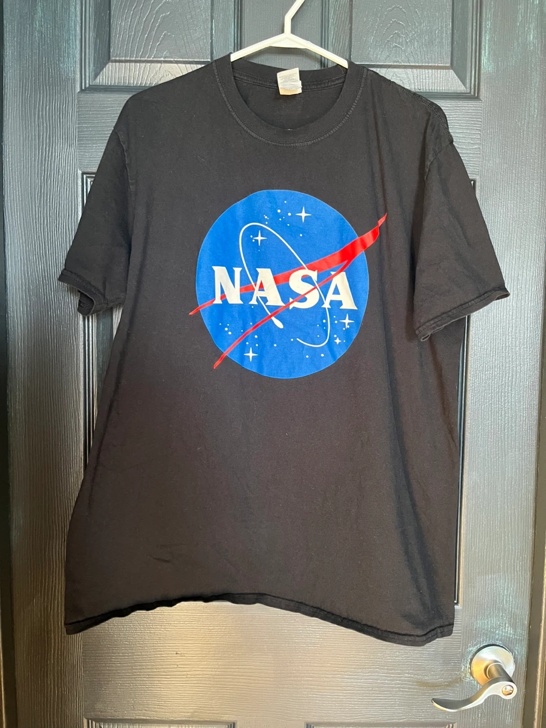 Black Gildan Softstyle t-shirt featuring the classic NASA logo on the front. Made in Bangladesh. Size XL. It's a comfy tee for space enthusiasts!