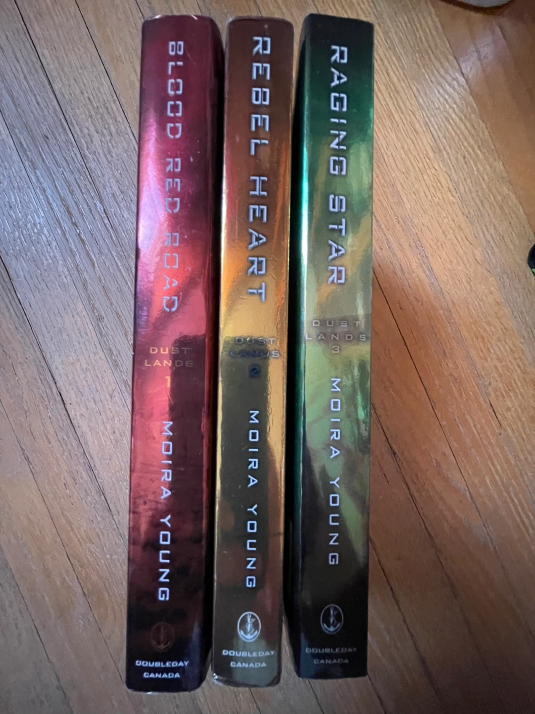 Collection of three Dust Lands series books by Moira Young. Includes Blood Red Road (1), Rebel Heart (2), and Raging Star (3). Published by Doubleday Canada.
