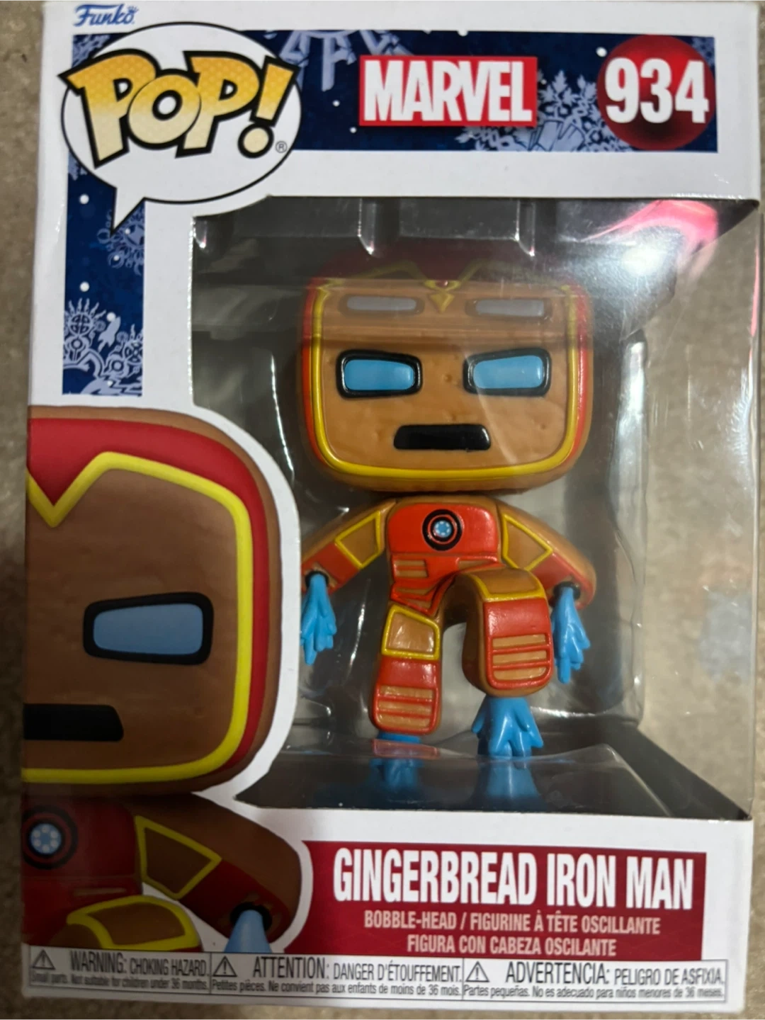 This is a Funko Pop! figure of Gingerbread Iron Man, number 934 in the Marvel series. It's a bobble-head figurine. This collectible is great for Marvel fans!