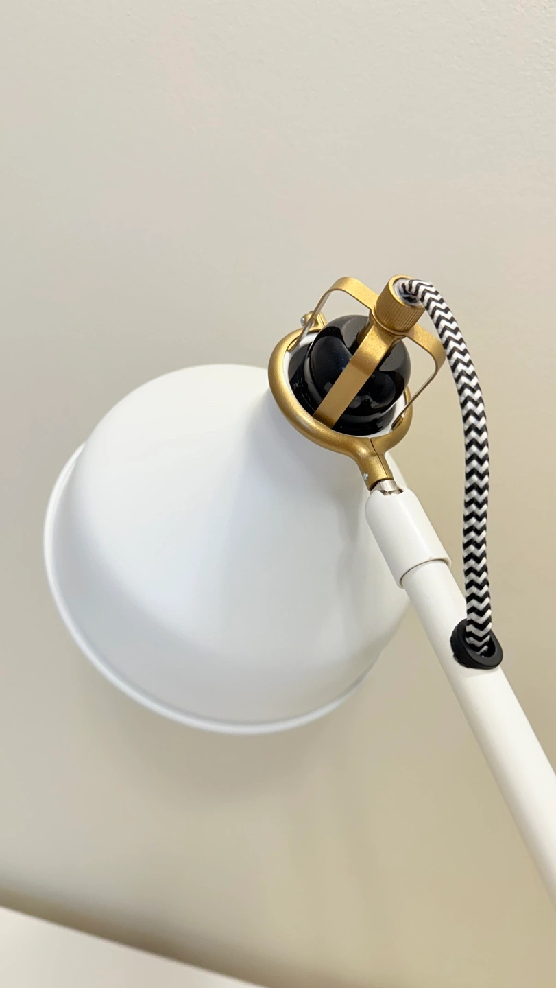 White desk lamp with gold accents, Has a flexible arm and a black and white cord.