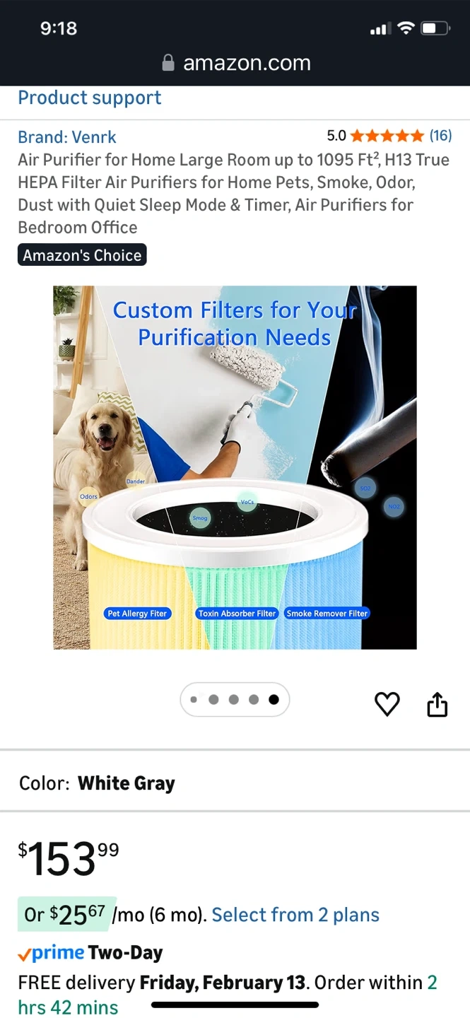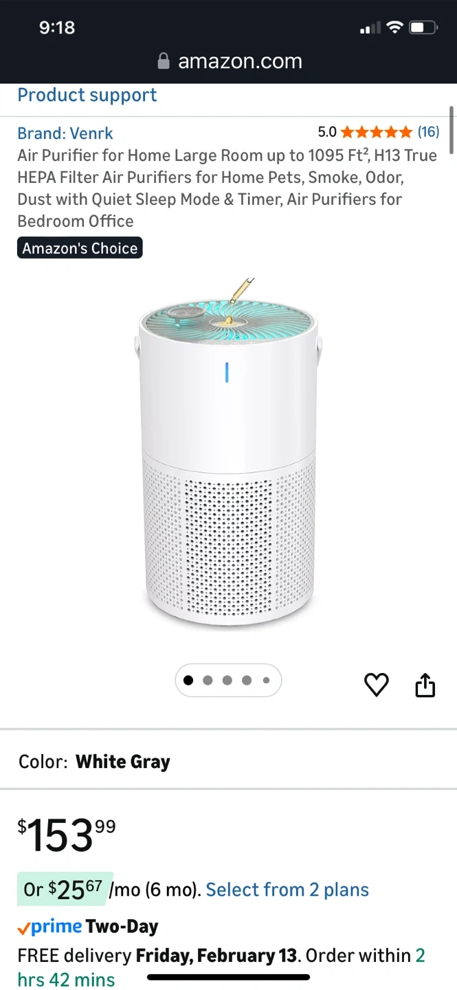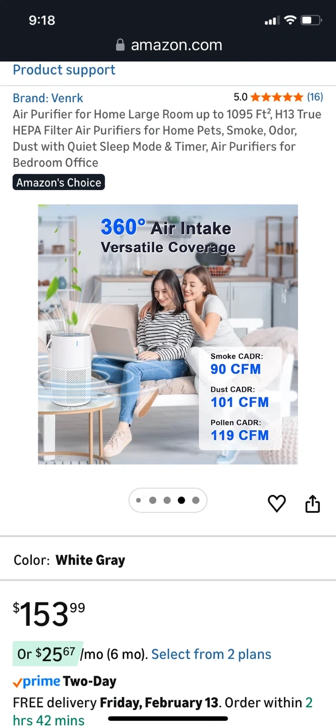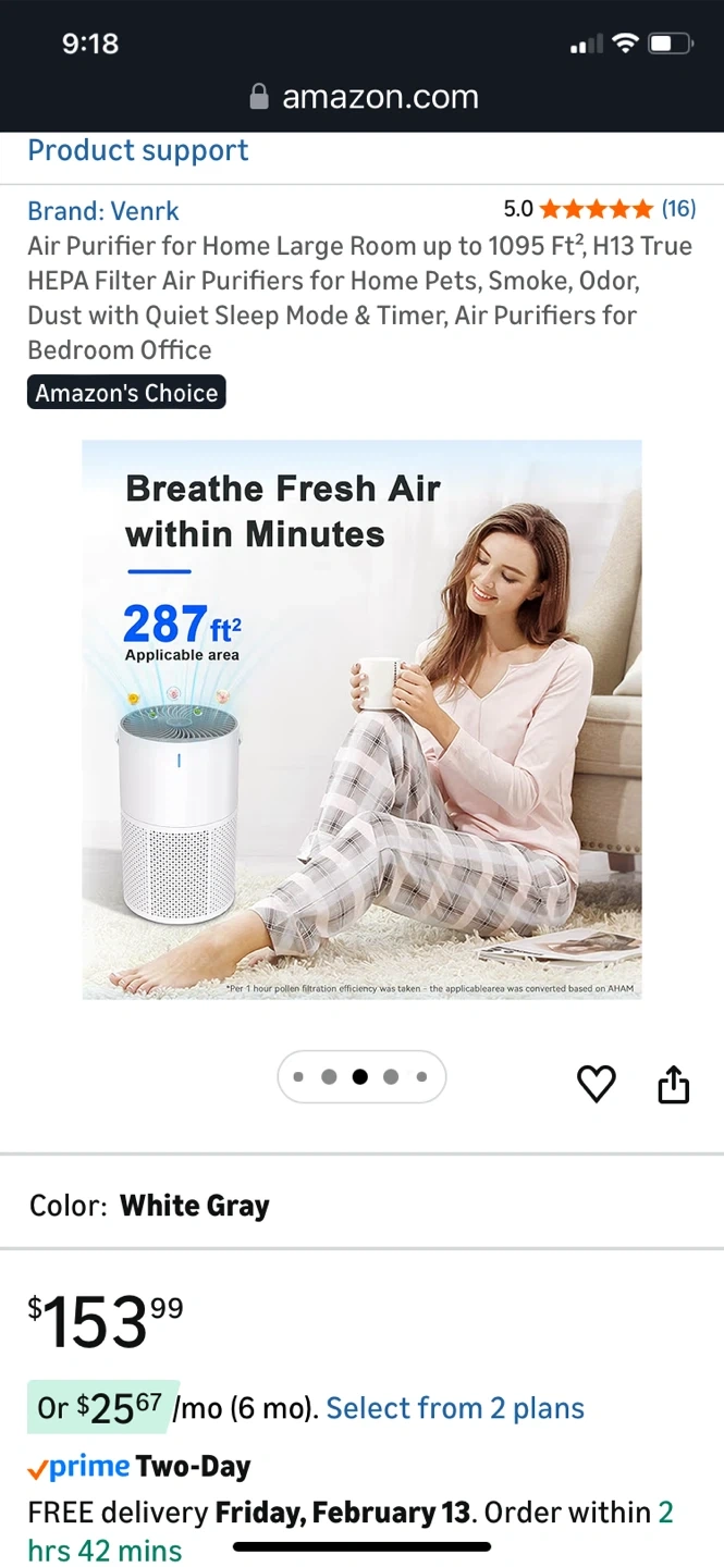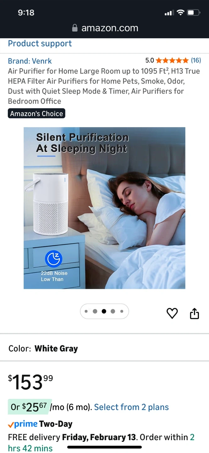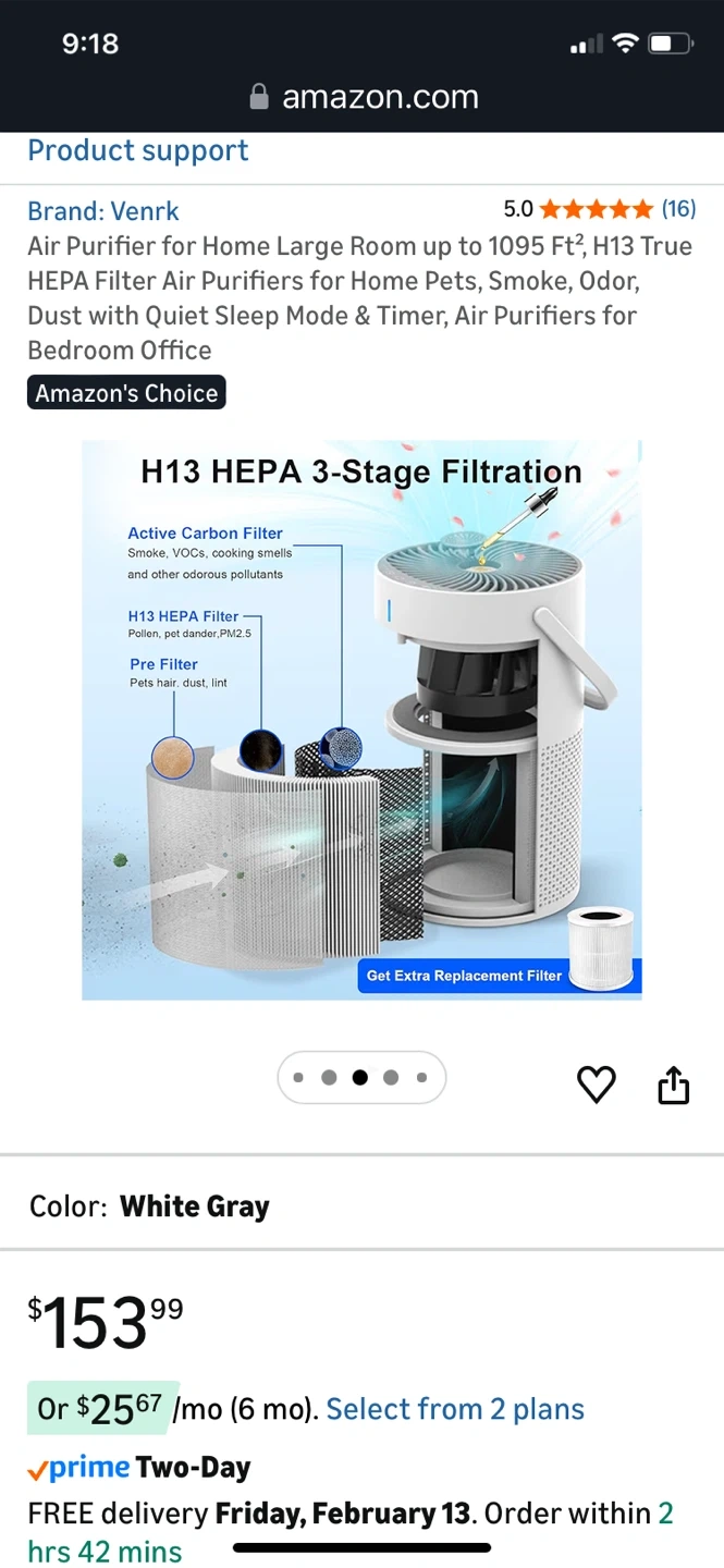This Venrk air purifier offers H13 True HEPA 3-stage filtration for large rooms up to 1095 sq ft. It effectively removes smoke, odors, pet dander, dust, pollen, and VOCs. Features quiet operation with a sleep mode and timer.