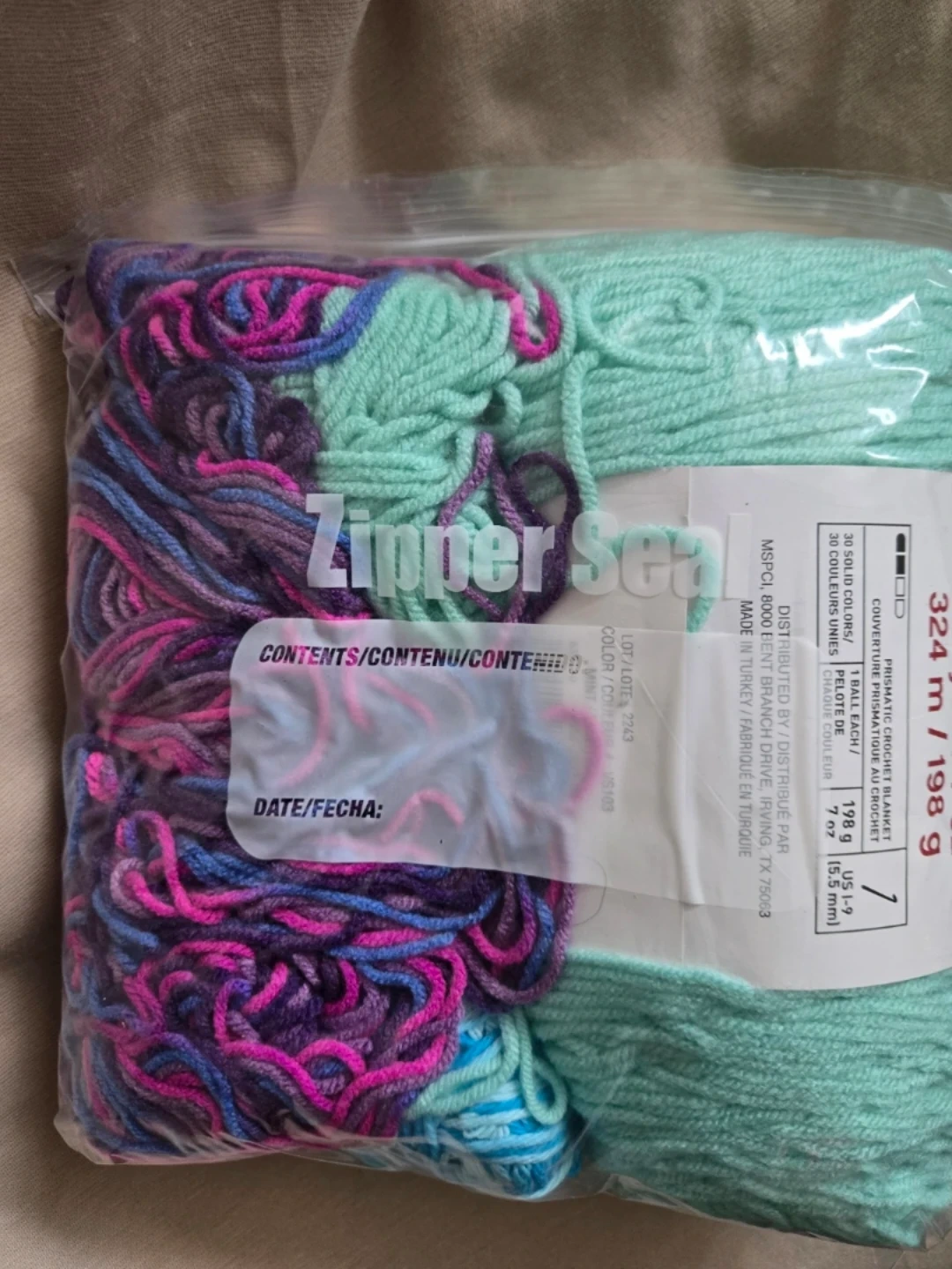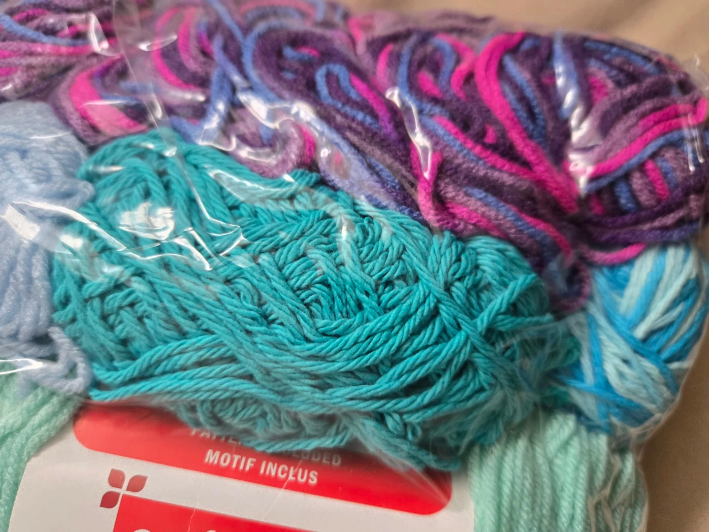-One full ball of craftsmart teal yarn, -Craftsmart mutlicolour purple yarn,