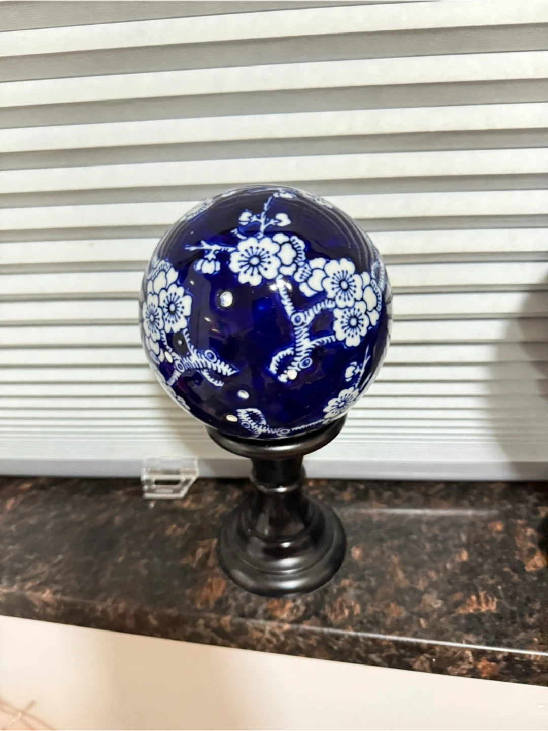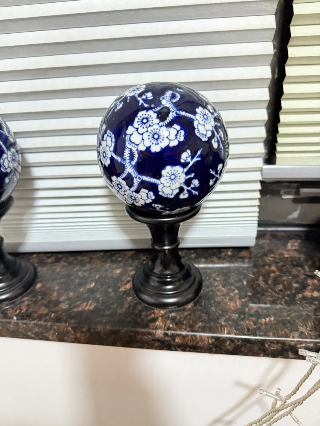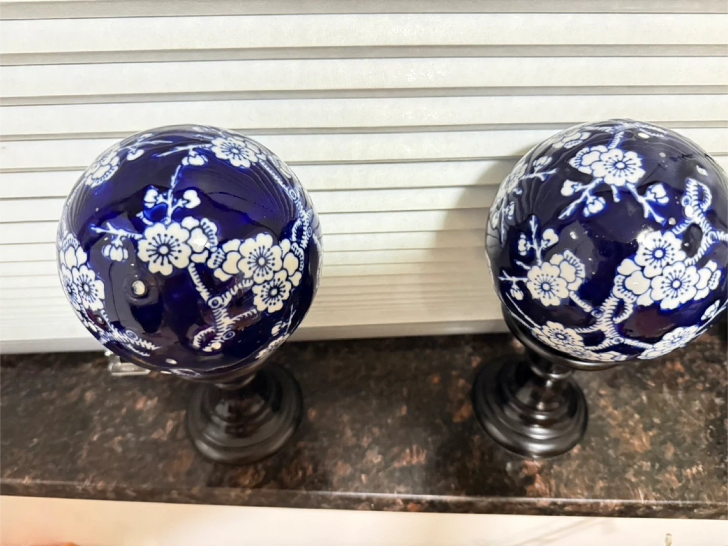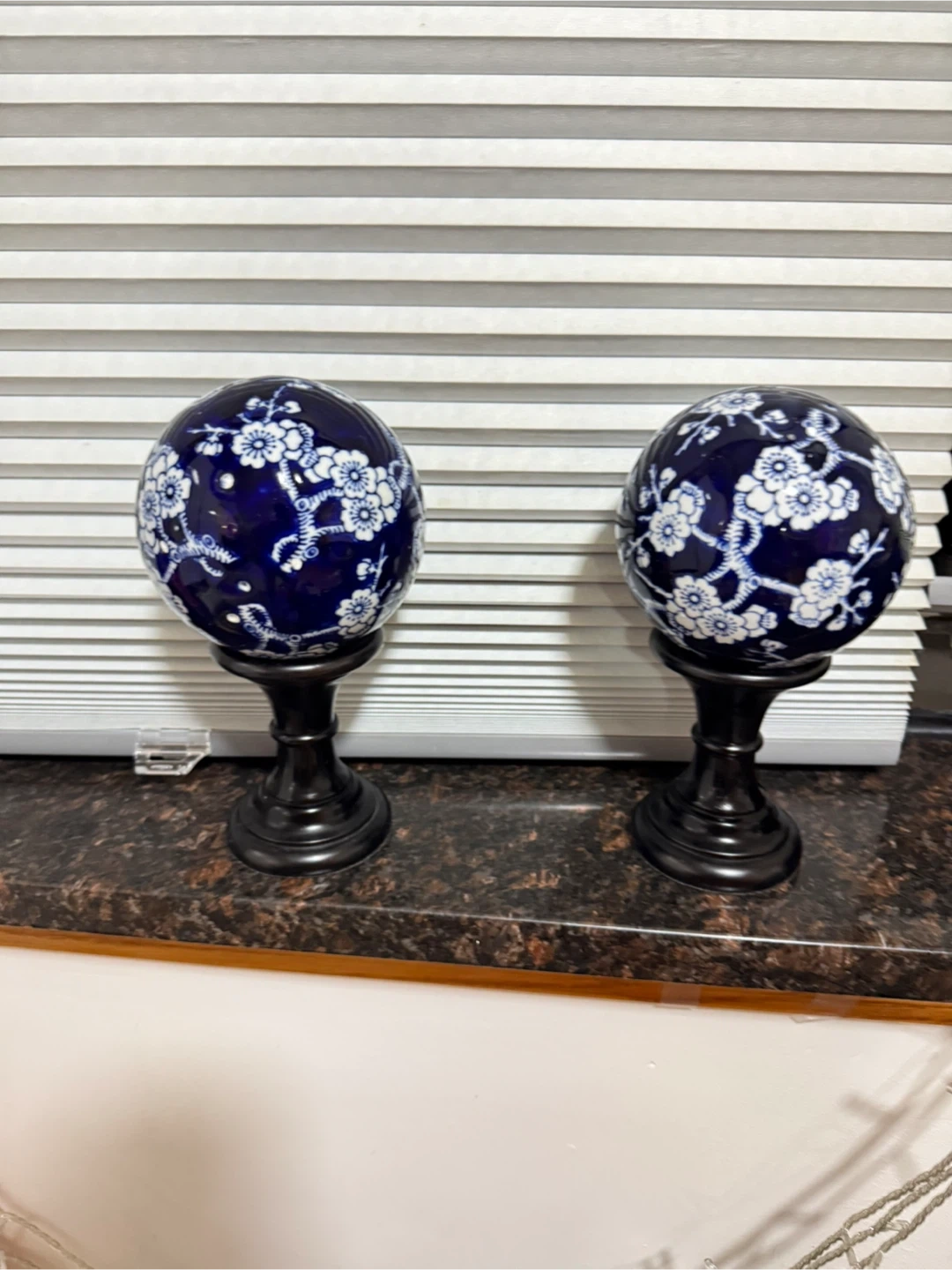 Set of two decorative orbs with a blue and white floral pattern. These orbs are mounted on dark stands. They're perfect for adding a touch of classic style to any shelf or table. Ceramic material.