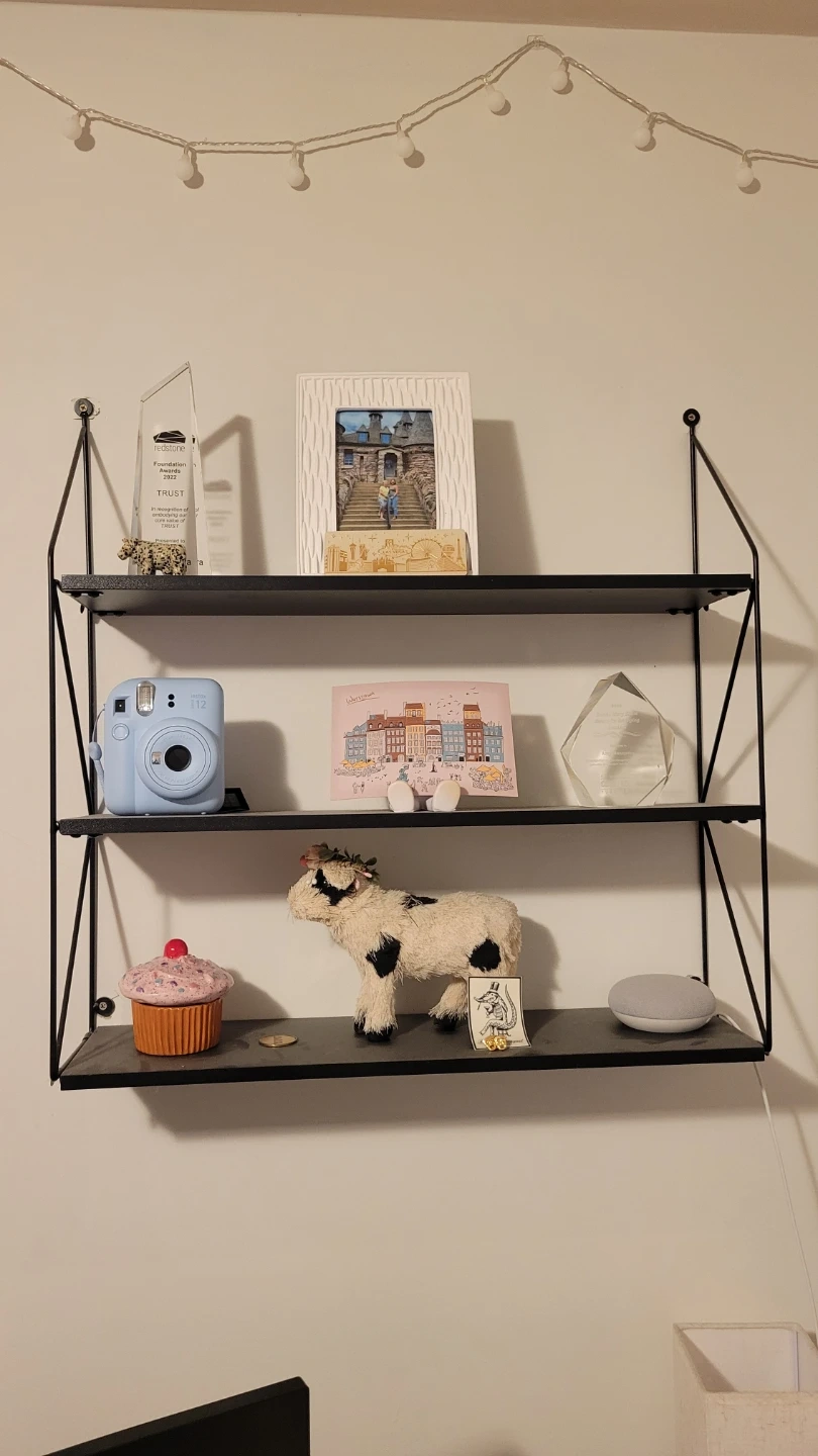This 3-tier wall-mounted shelf is sturdy and in like new condition with no marks or scratches on it.