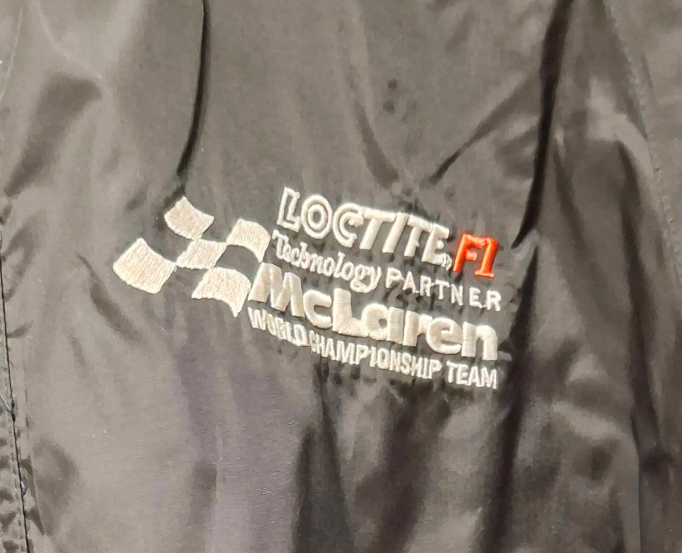 A lightly used all weather waterproof black jacket with elasticized cuffs. The jacket has McLaren World Championship Team embroidered logo.