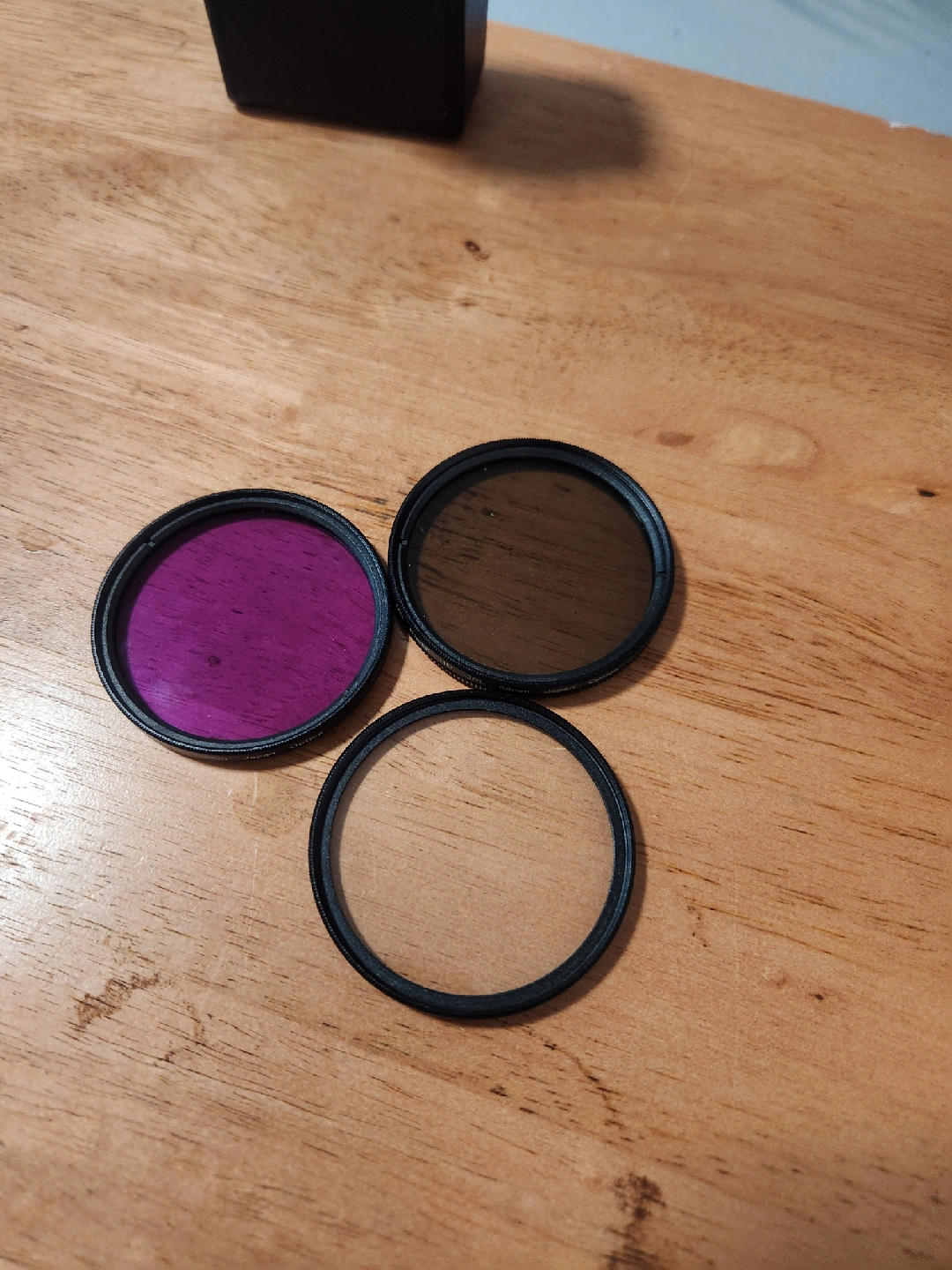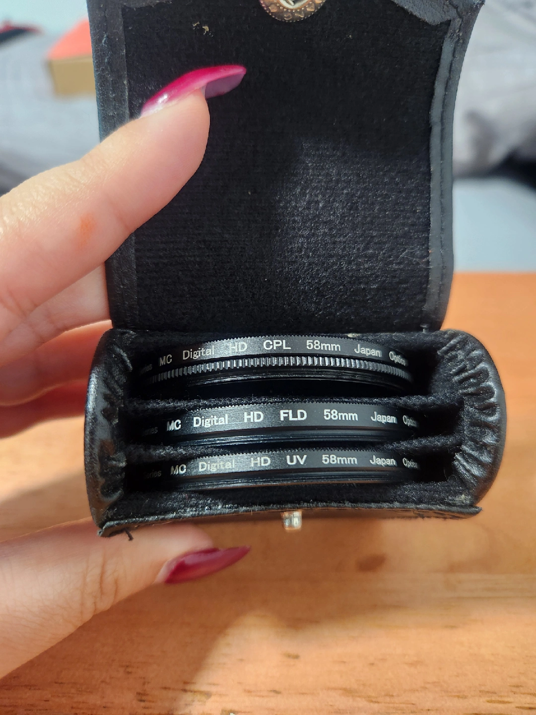 Includes a set of three 58mm filters: UV filter, CPL and FLD.