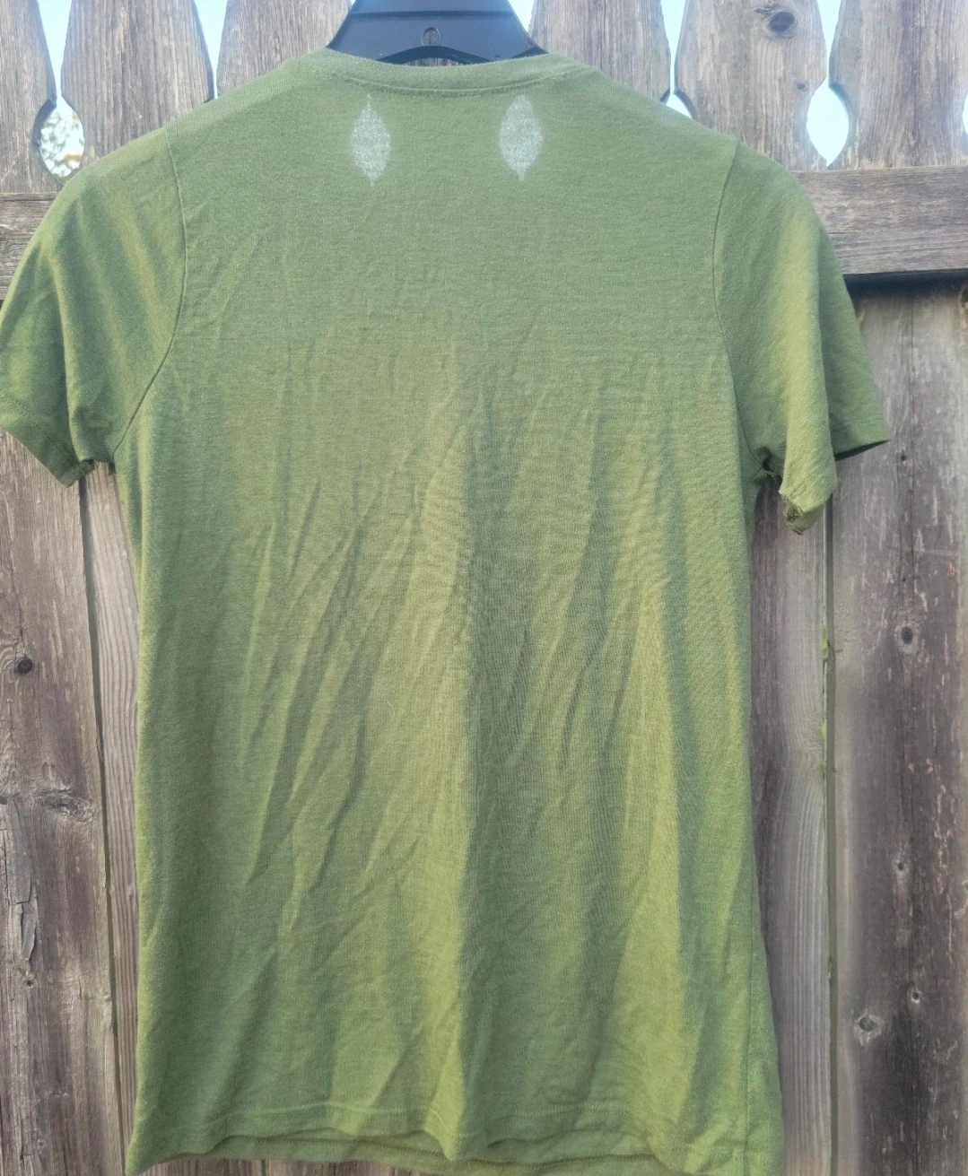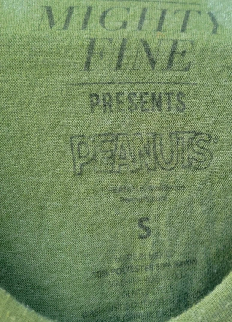 Green short-sleeve t-shirt featuring Snoopy and Woodstock graphic. 50% Polyester, 38% Cotton, 12% Rayon. Made in Mexico. Size is small.