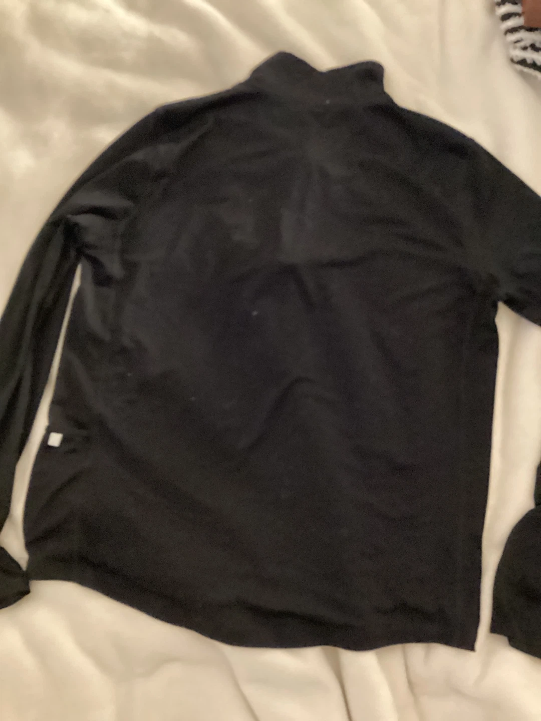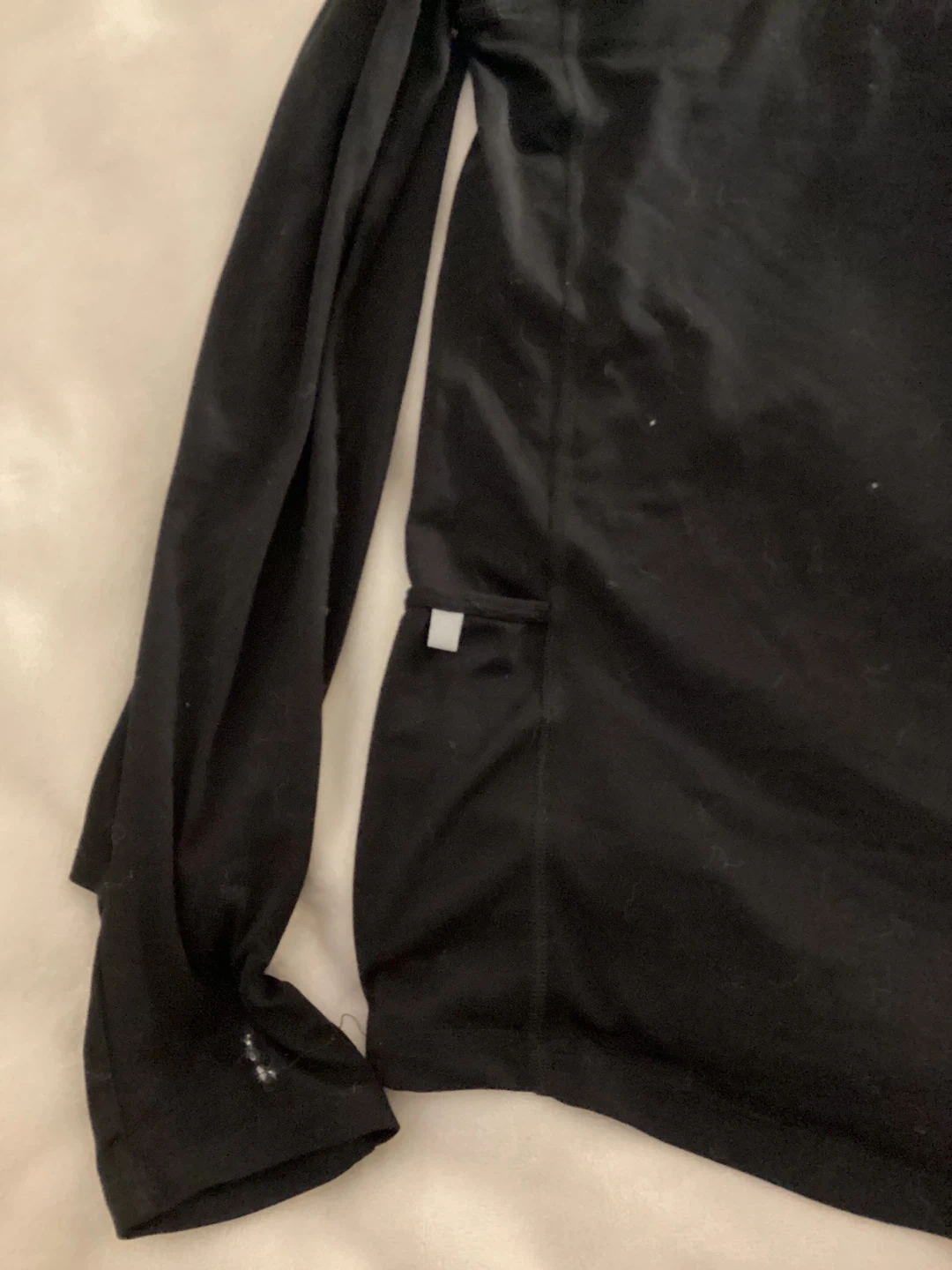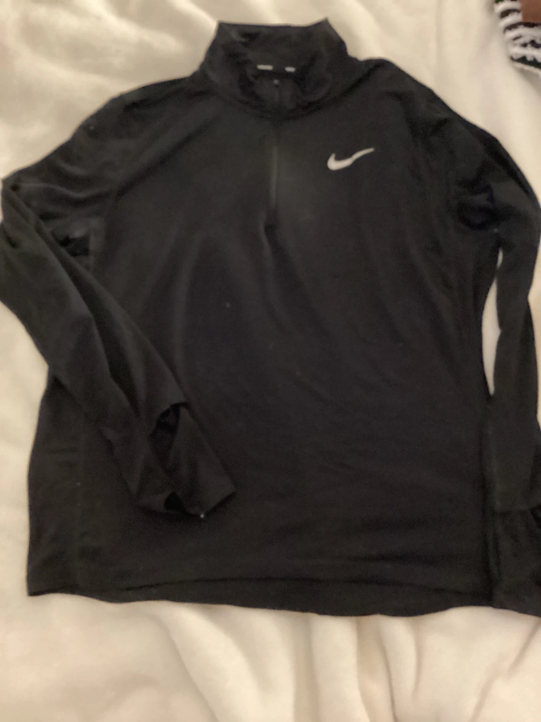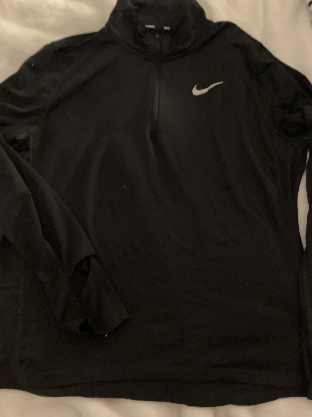 This is a black Nike running top with a 1/2 zip closure and thumbholes. It's made of lightweight, moisture-wicking fabric. Great for outdoor runs in cooler weather!