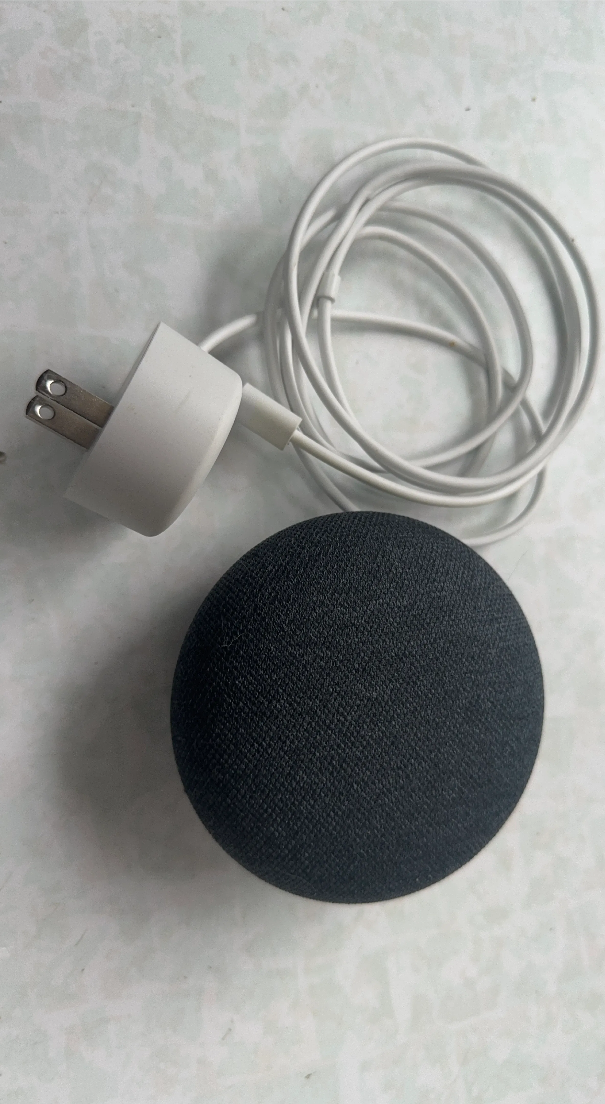 This is a Google Nest Mini smart speaker in charcoal. It's the second generation model. Includes power adapter and cable.