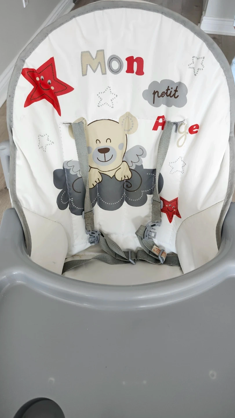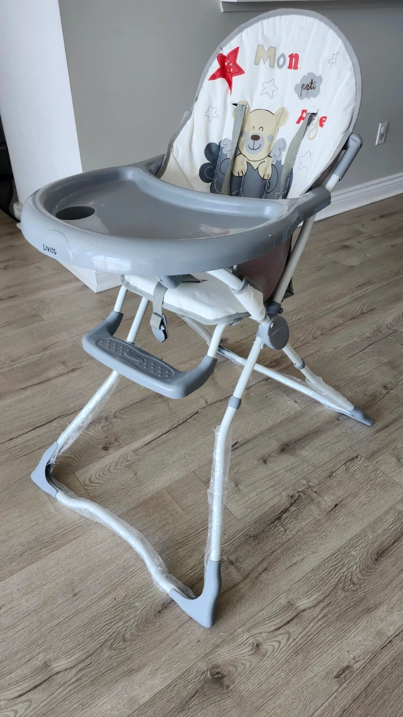 This LIVIQO high chair comes with a padded seat and tray. It's designed with a cute teddy bear theme. The chair is foldable for easy storage.