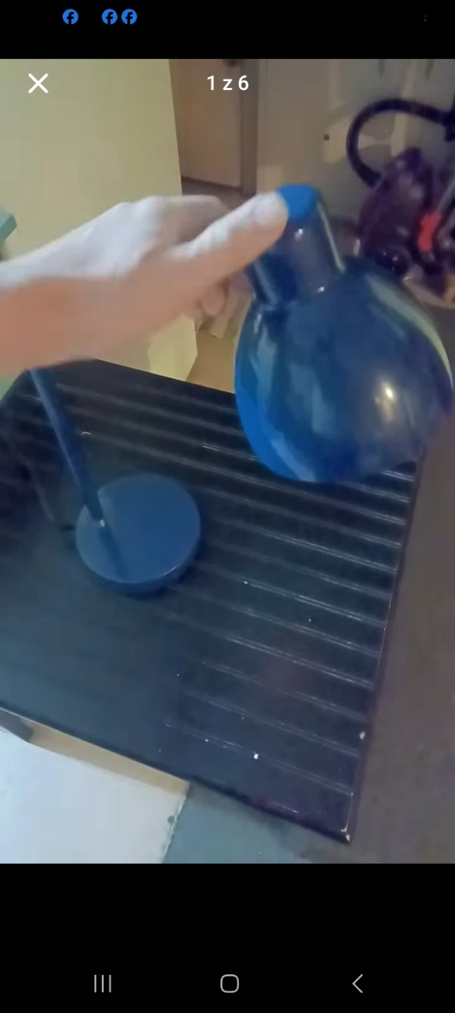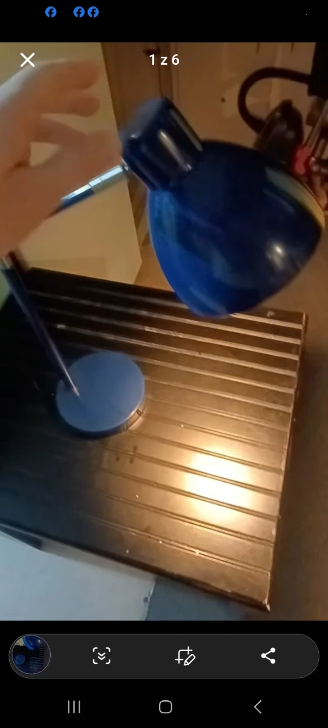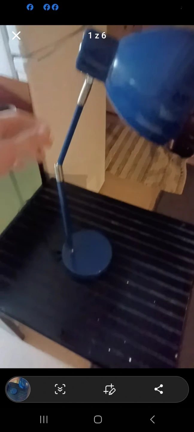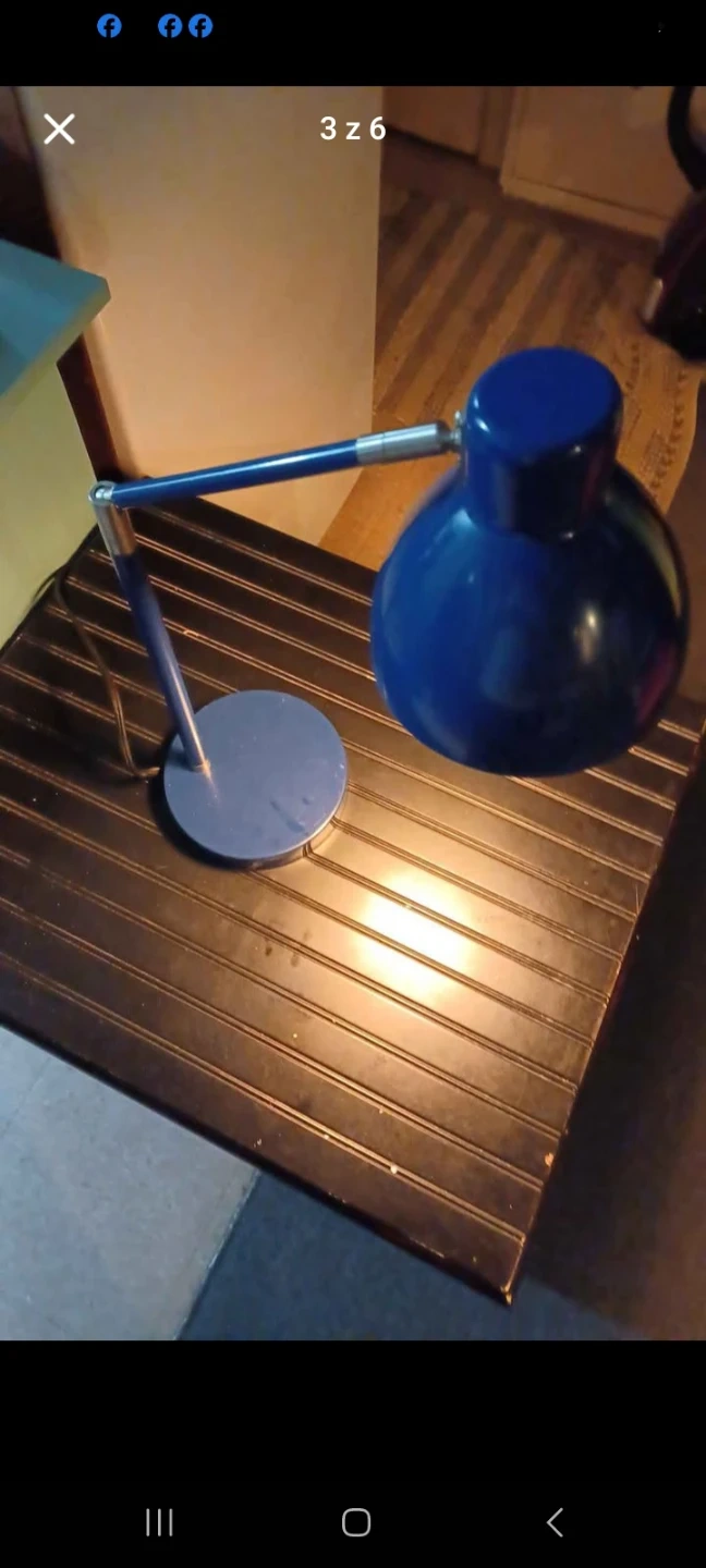 Navy blue with silver accents touch light adjustable desk lamp. Would look great on a desk in a home office. Measures approximately 6 inches by 6 inches by 25 inches tall.