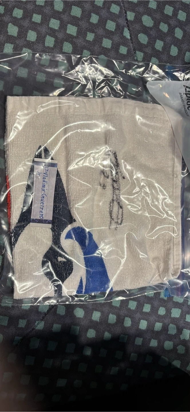 10Selling a Vladimir Guerrero Jr. hand towel. It's white with blue and red accents, and features a design related to Vladimir Guerrero Jr.