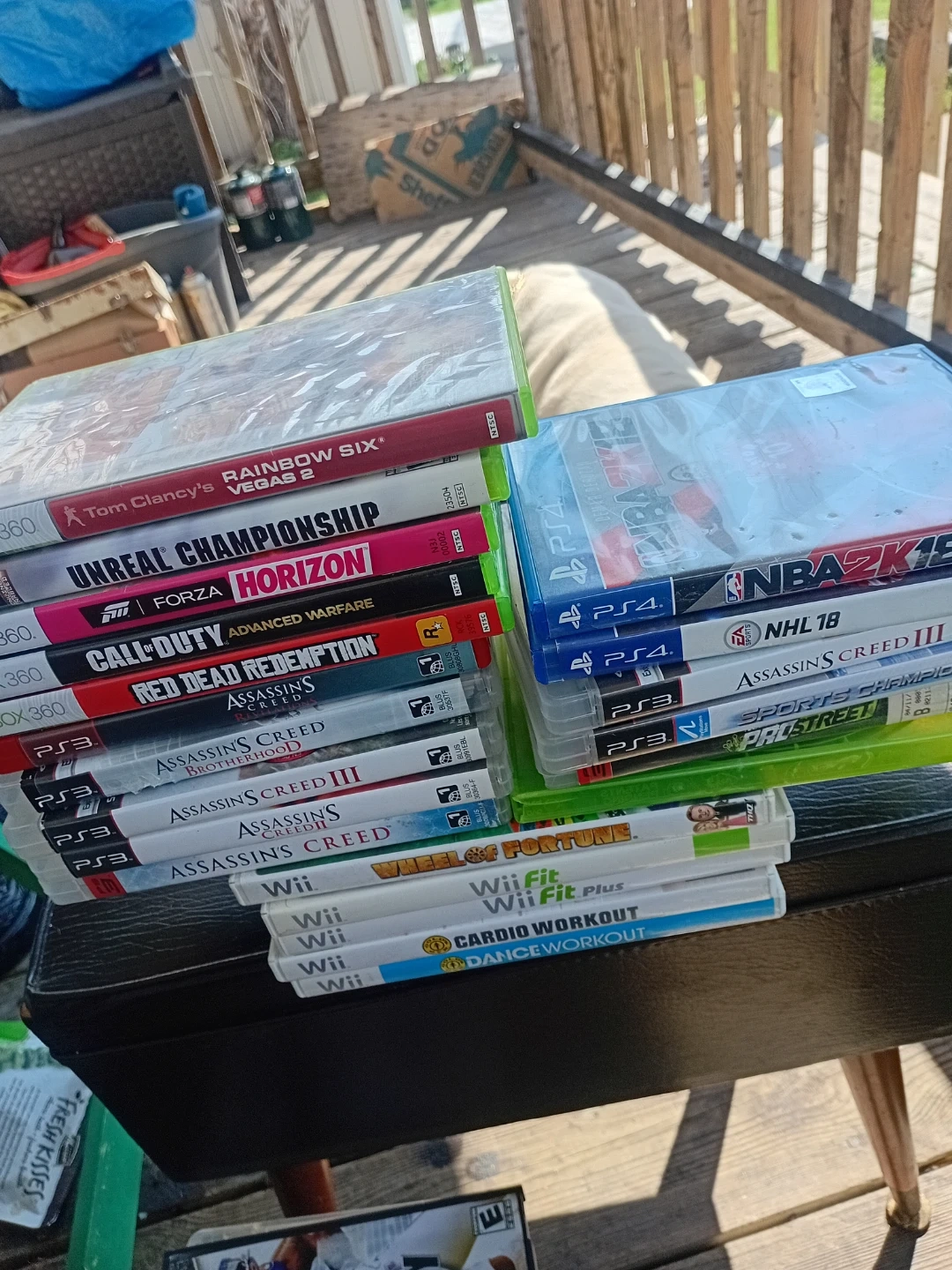 Bundle of assorted video games for Xbox 360, PS3, and Wii. Includes titles like Assassin's Creed series, Forza Horizon, and Wii Fit. All games are in original cases.