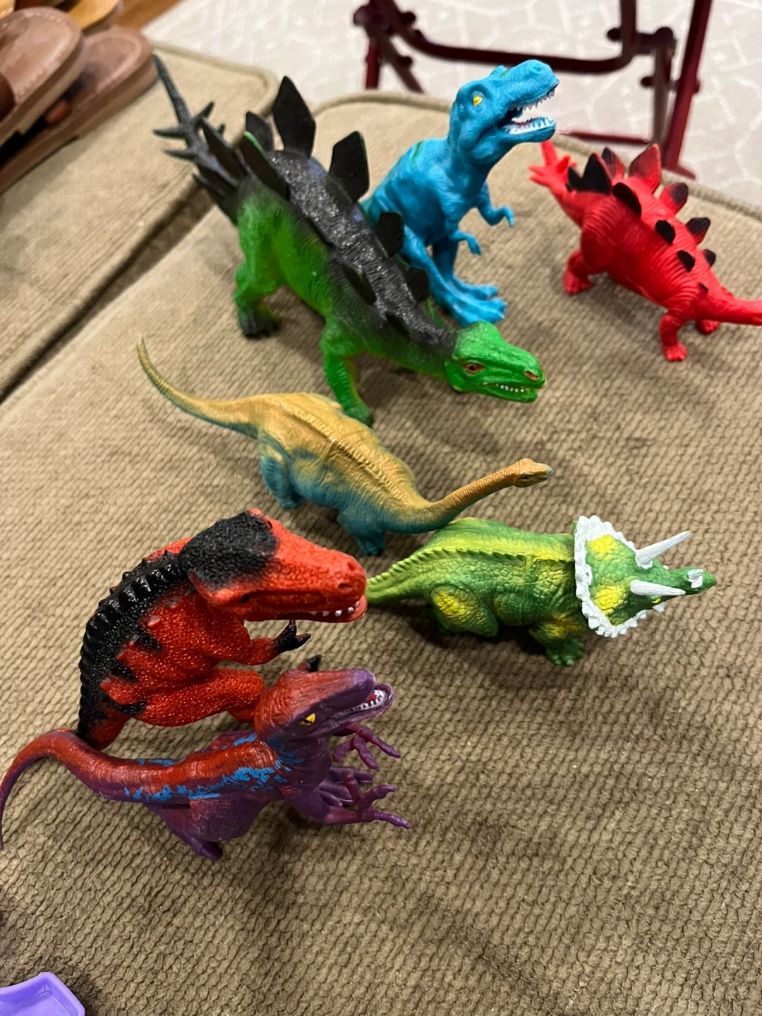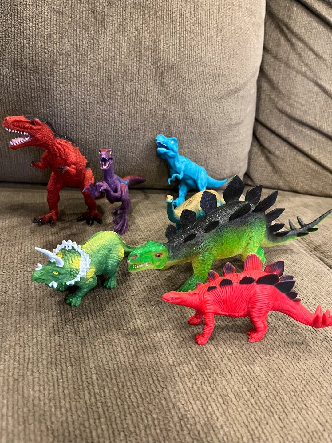 A collection of dinosaur toy figures including a Tyrannosaurus Rex, Velociraptor, Stegosaurus, Triceratops, and more. Also includes a dinosaur-shaped pop-it fidget toy in rainbow colours. Hours of fun for kids!