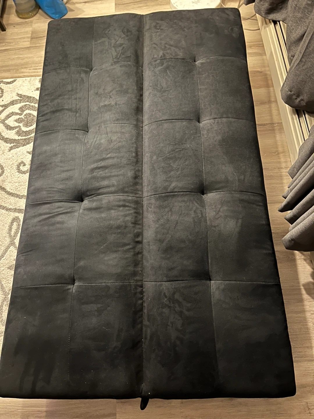 Simple black Futon, perfect for seating or a quick bed. Last pic shows a spring has come out at the bottom, price does reflect this.