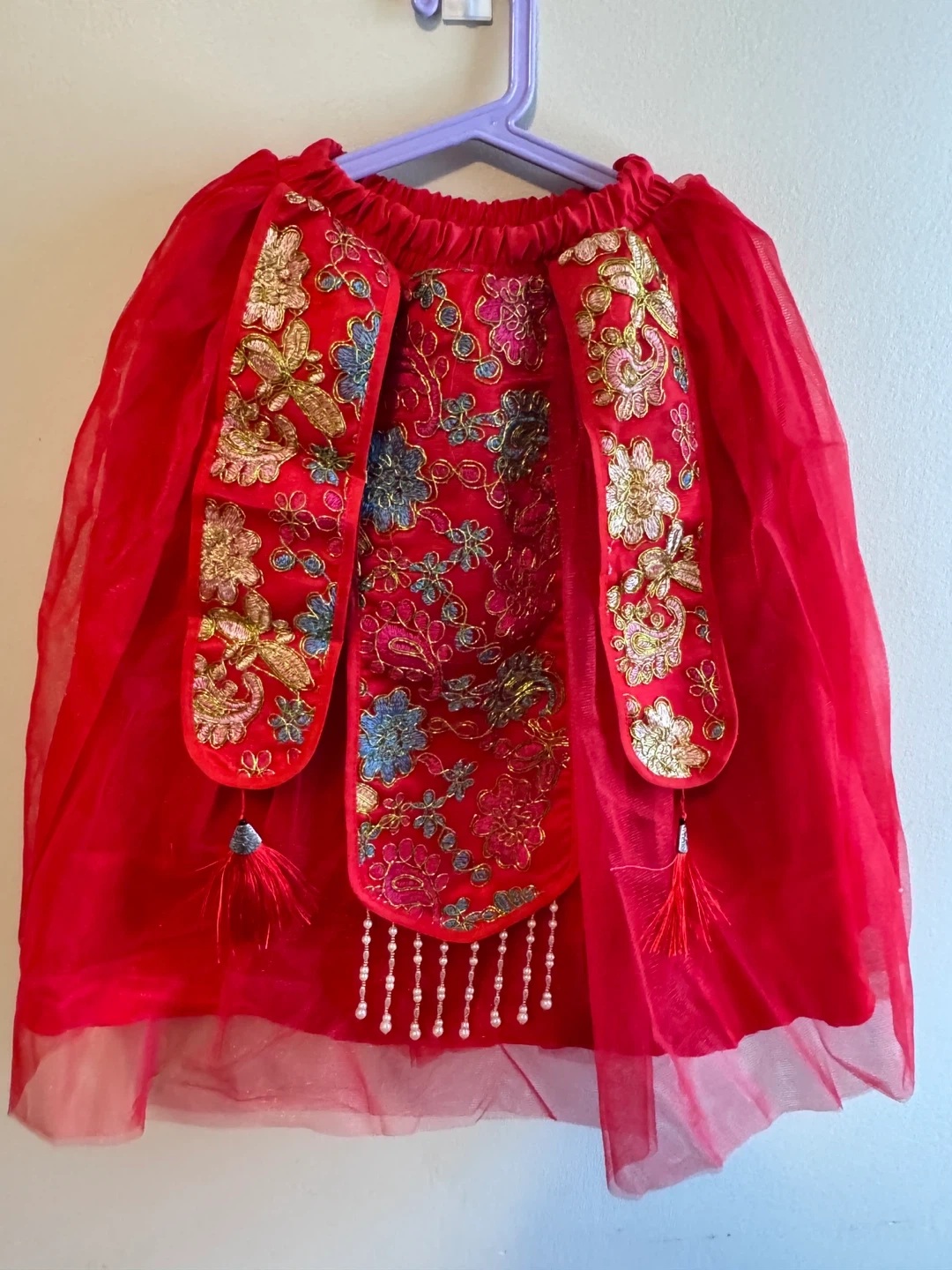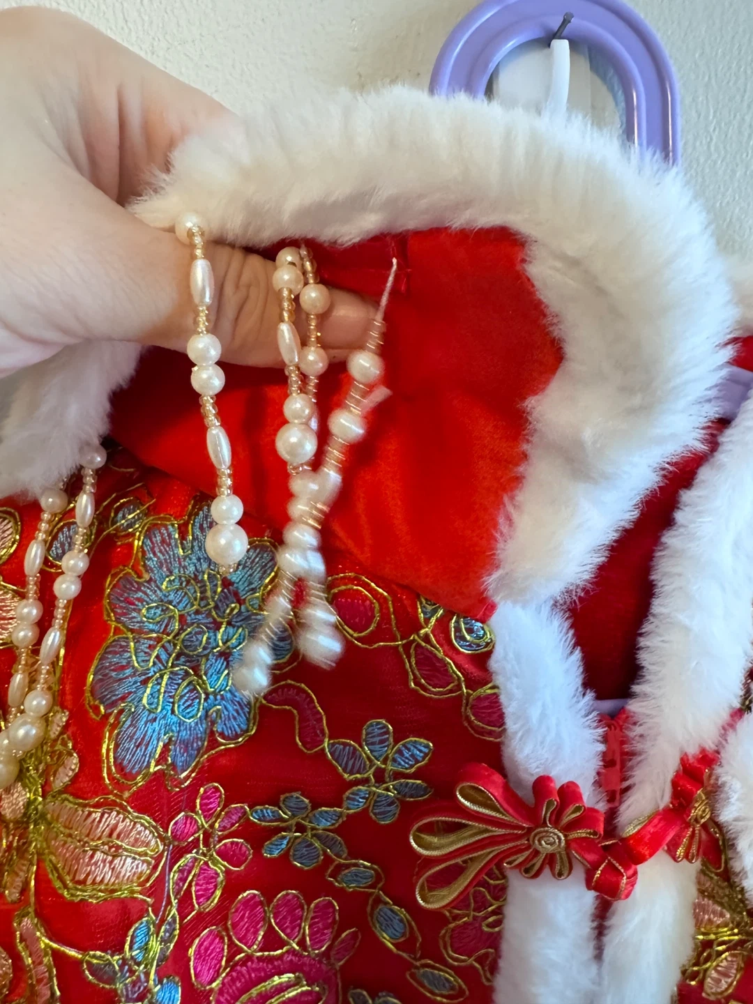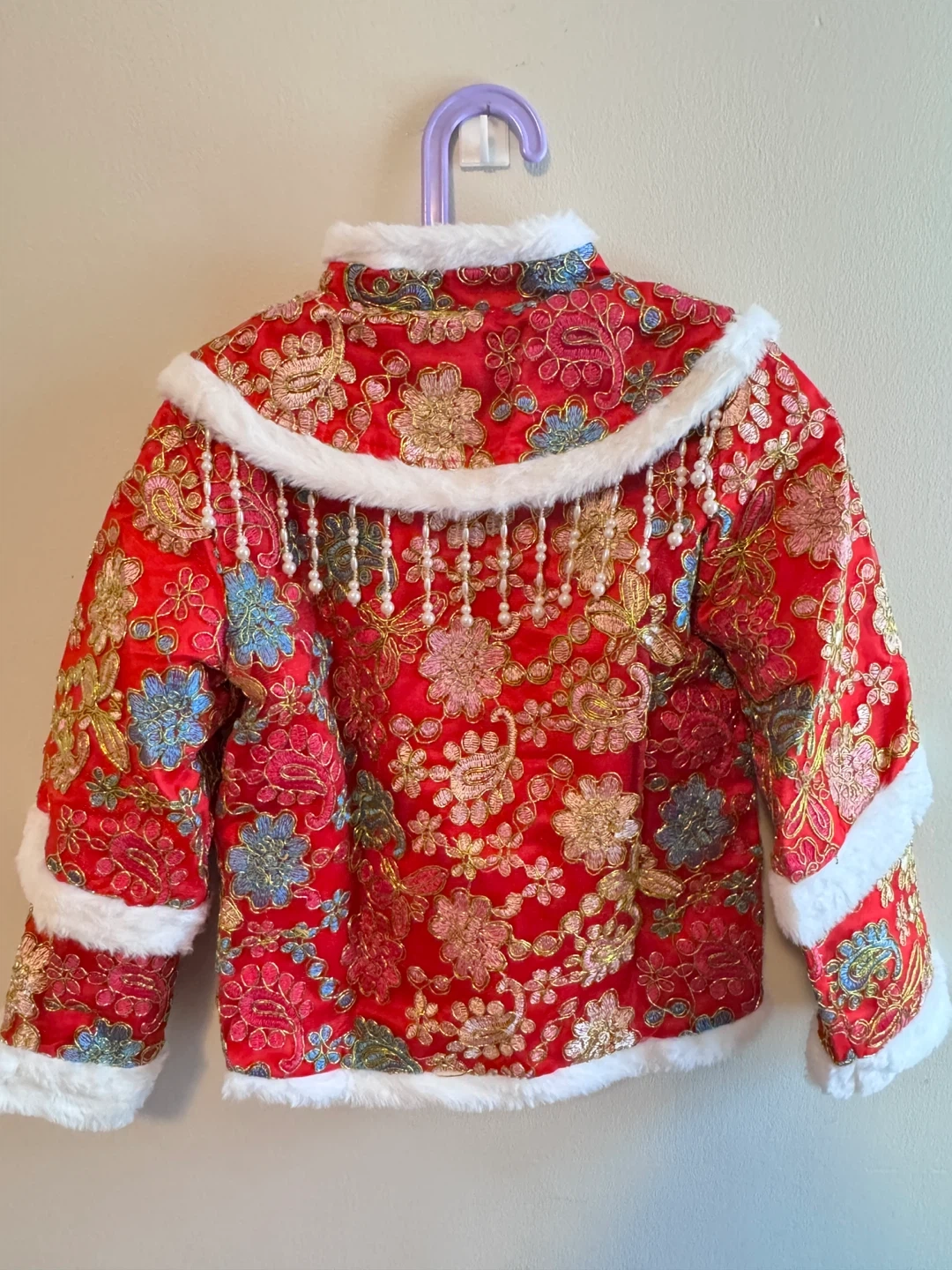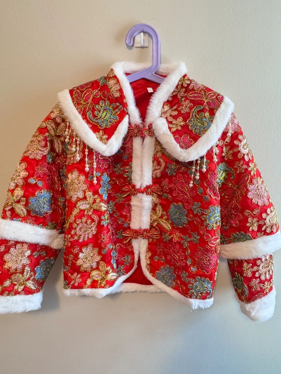 A beautiful red jacket perfect for Chinese New Year celebrations! It features intricate floral embroidery, a soft faux fur trim, and cute pearl detailing. It's in great condition and ready for a new home