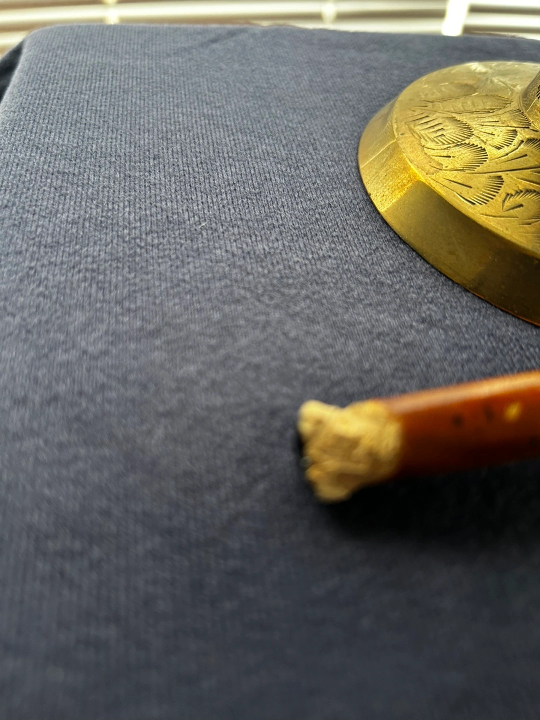 Ornate brass bell on a stand. Features an etched design. Includes wooden striker. Made in India.