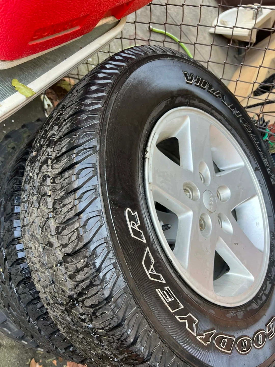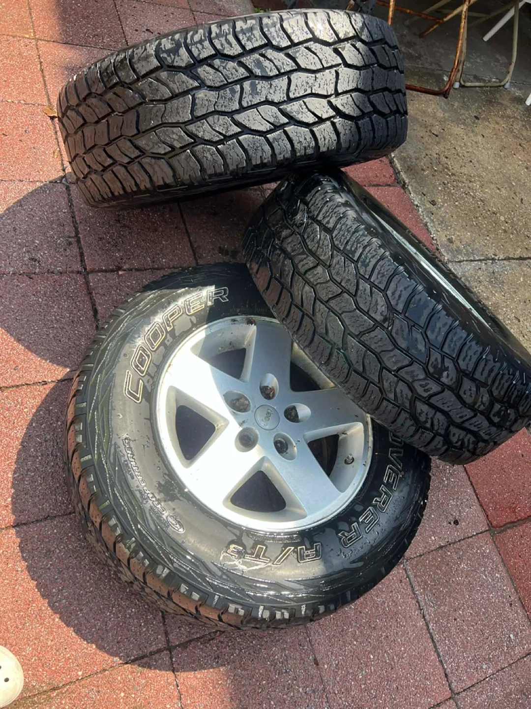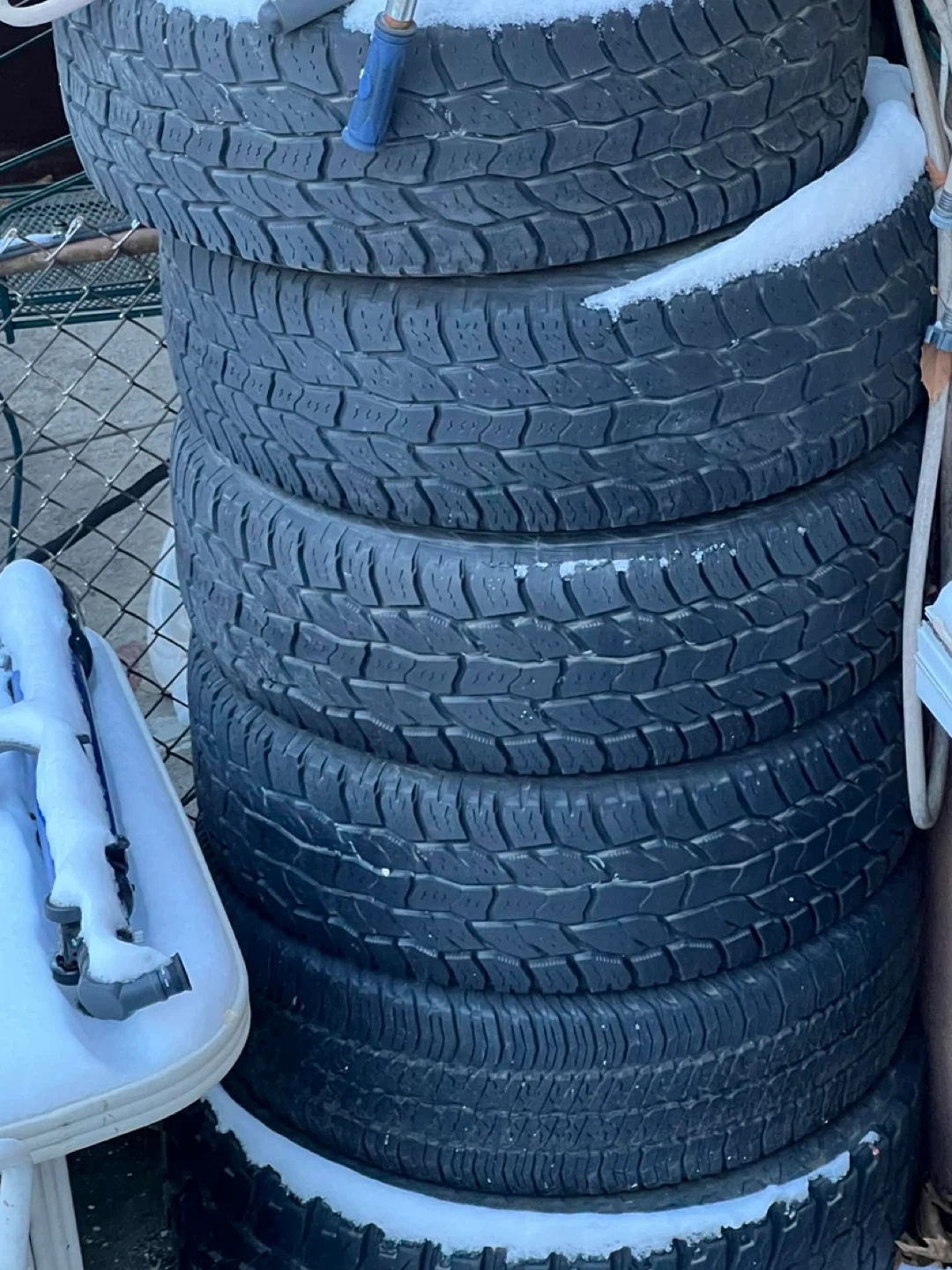 Four all-terrain tires from Cooper. They are sized LT265/70R17. Two of the tires are Cooper Discoverer A/T3 and two are Goodyear Wrangler All-Terrain Adventure with Kevlar.
