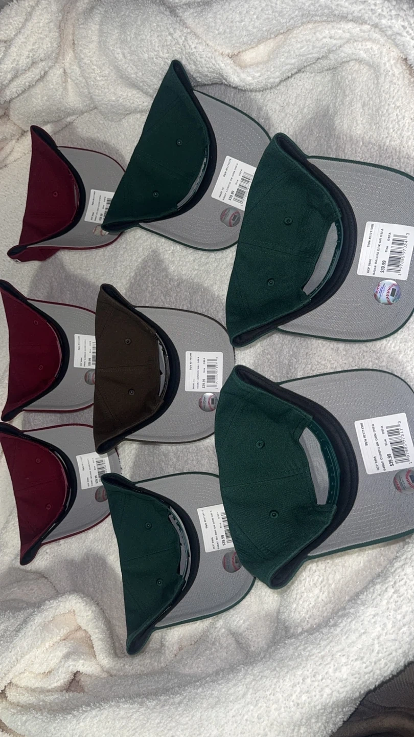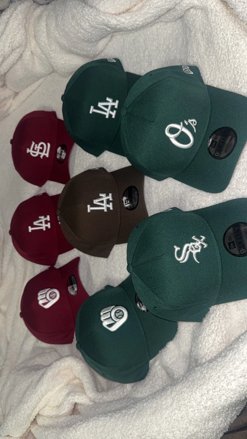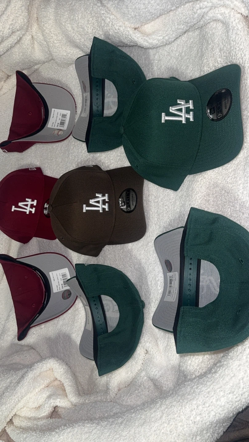 Bundle of New Era 9FIFTY baseball caps. Includes maroon, brown, and green styles with various team logos. Adjustable snapback closure. These caps are a one-size-fits-most design. Great for any sports fan!