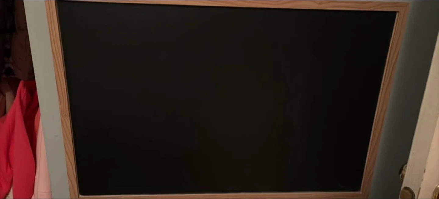 A classic chalkboard with a light wood frame. It's perfect for jotting down notes or displaying messages. The writing surface is smooth and ready for chalk.