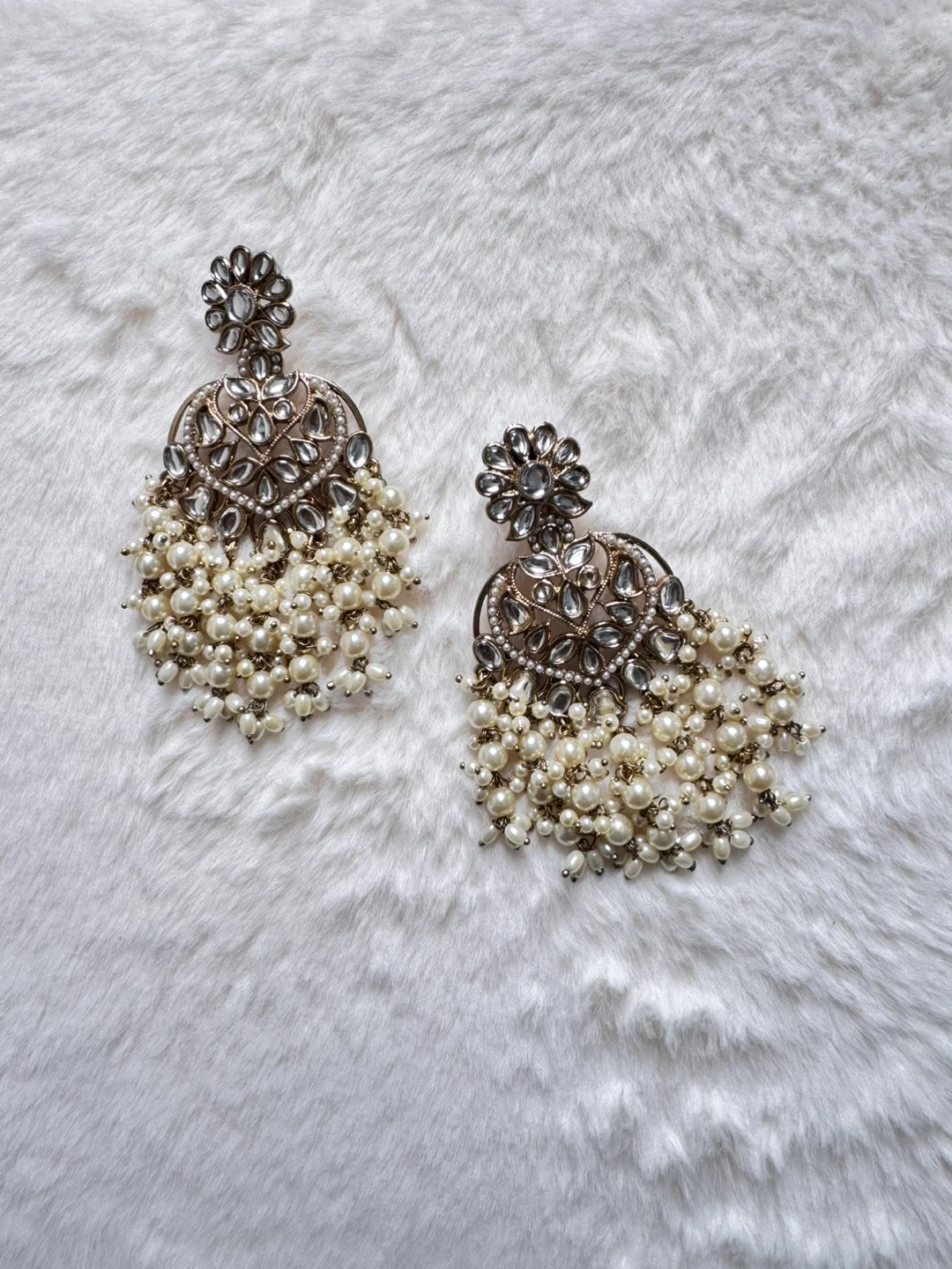 These elegant dangle earrings feature a chandelier design adorned with clear crystals and small pearls. They're designed to catch the light beautifully. These would be stunning for formal events or special occasions!
